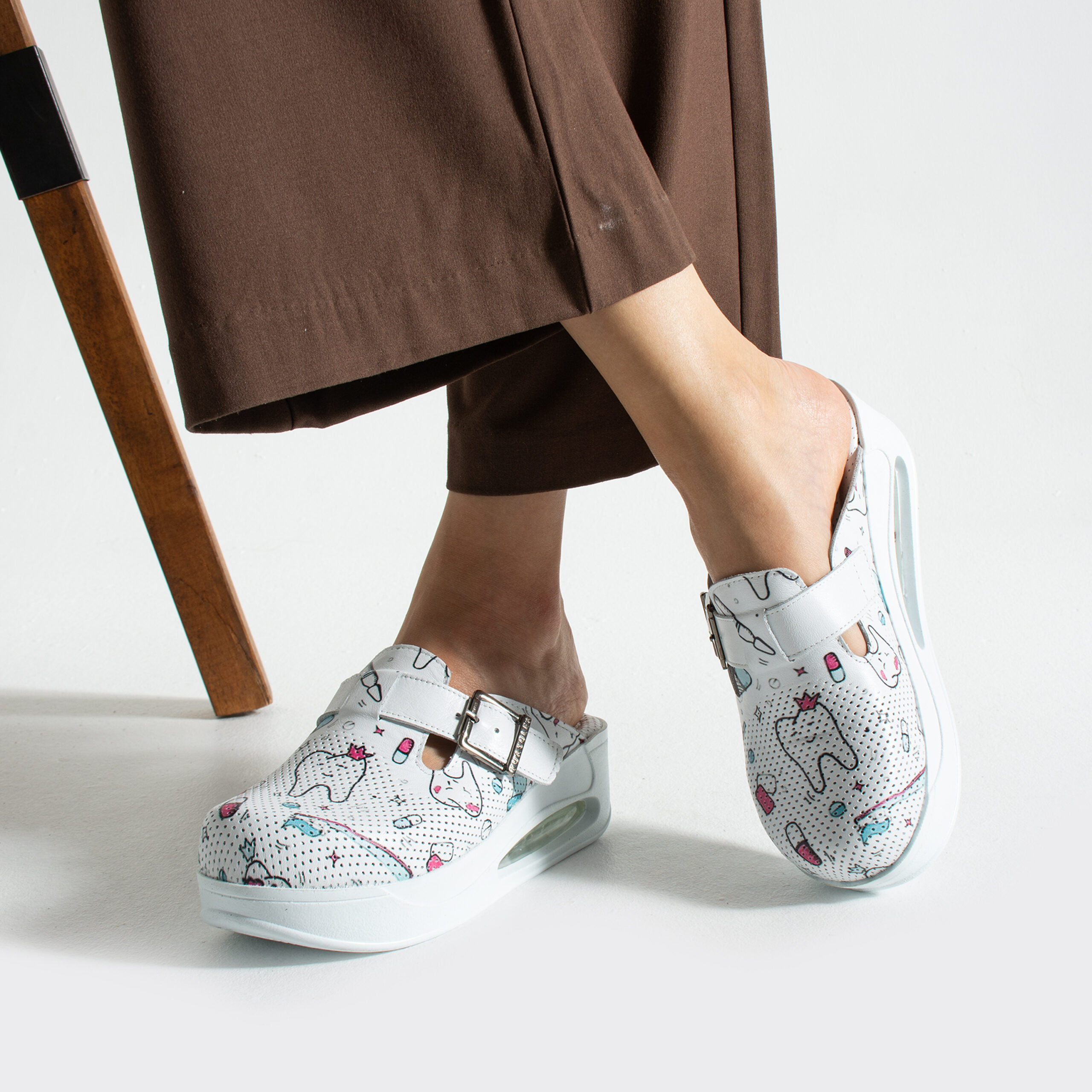 Анатомичните чехли Toothy са създадени за професионалисти в денталната сфера, които прекарват дълги часове на крак. Изработени от естествена кожа с прецизна перфорация, те осигуряват добра циркулация на въздуха и предотвратяват запарване. Тематичният принт, подходящ за зъболекари и асистенти, допълва работната визия по свеж и запомнящ се начин.