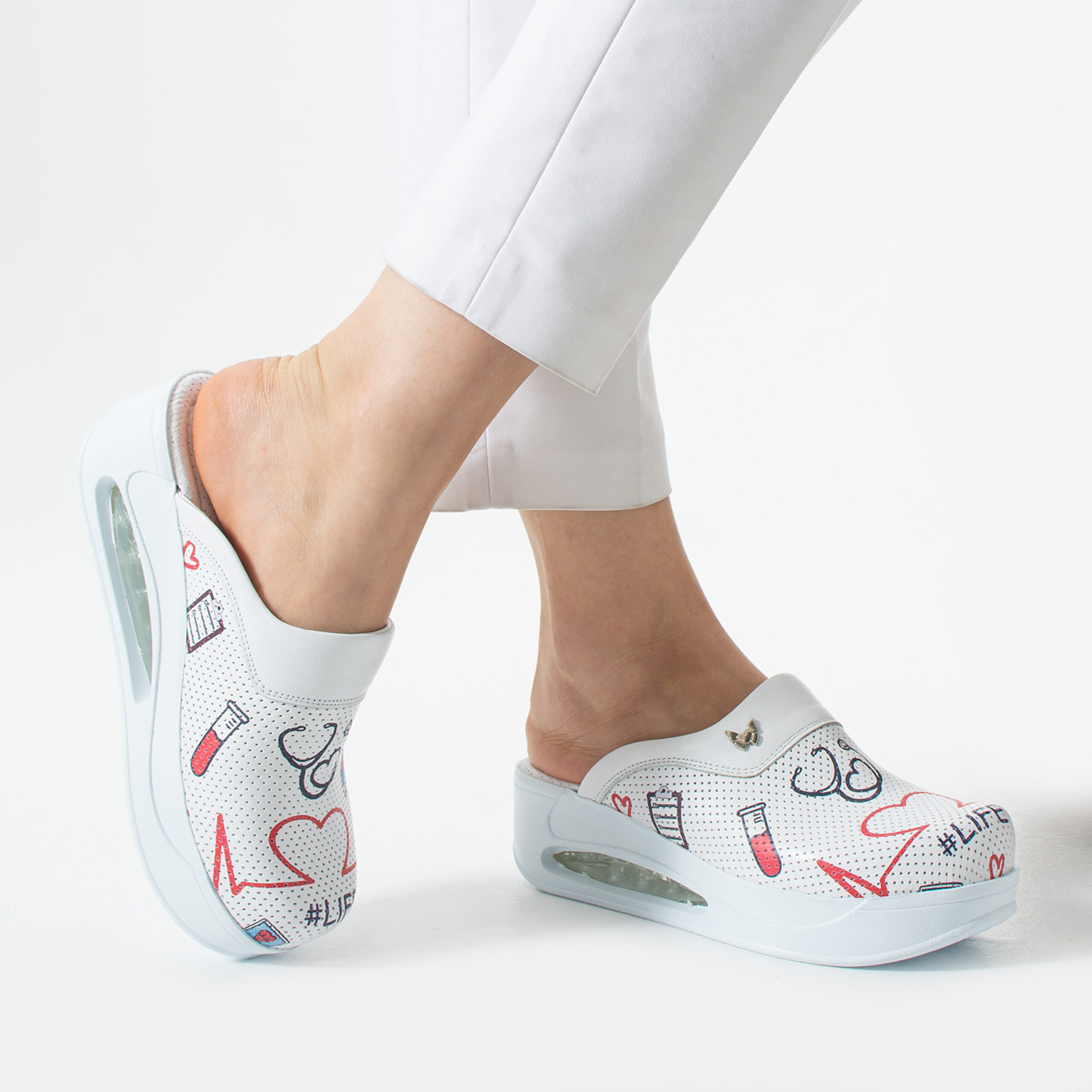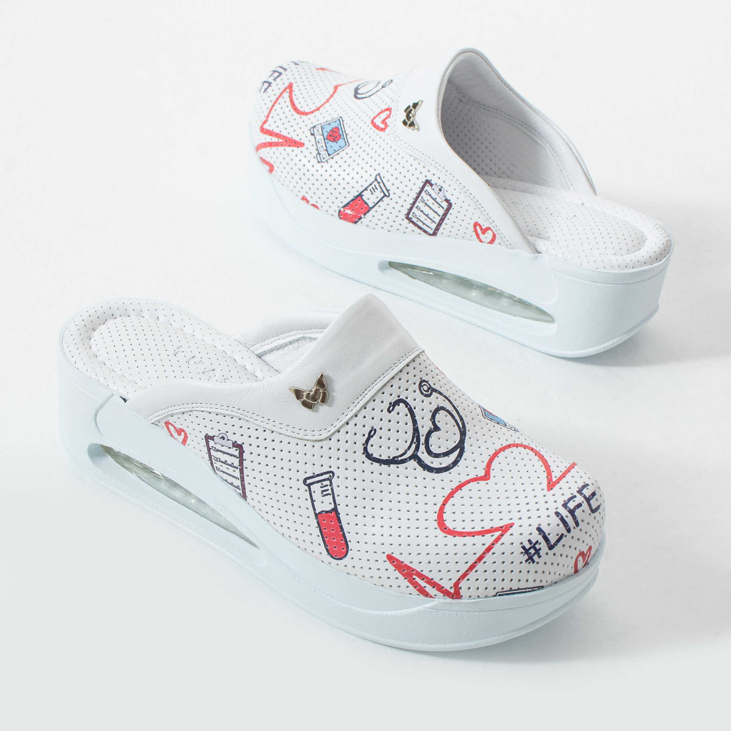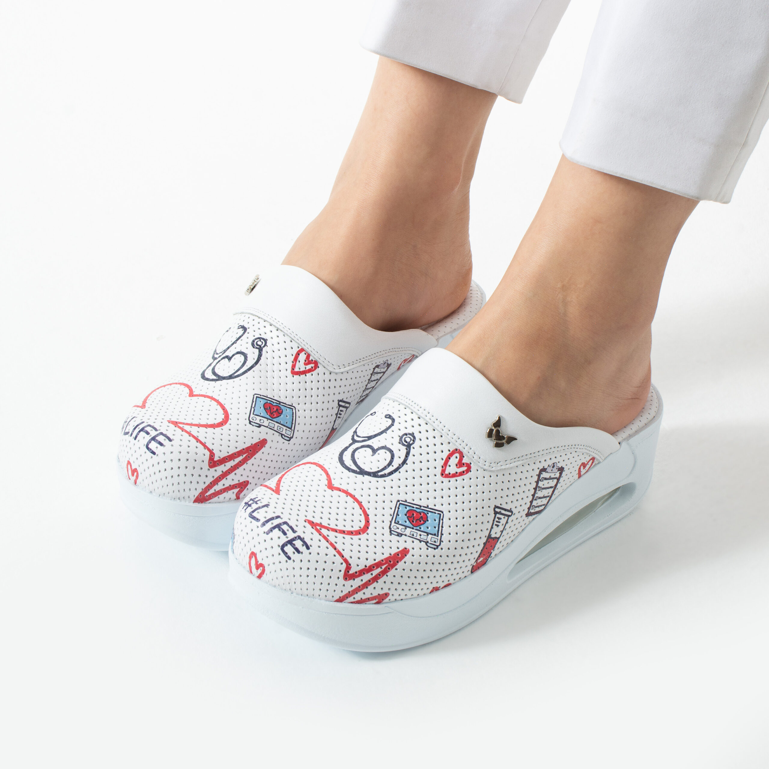 AirForm Classic на TUASOLEA са удобни и качествени анатомични медицински чехли на платформа, изработени изцяло от естествена кожа. Белият цвят с принт Pulse, вдъхновен от ритъма на здравната среда, е съобразен с професионални места като болници и клиники – разпознаваем и тематичен, но без да стои натрапчиво.