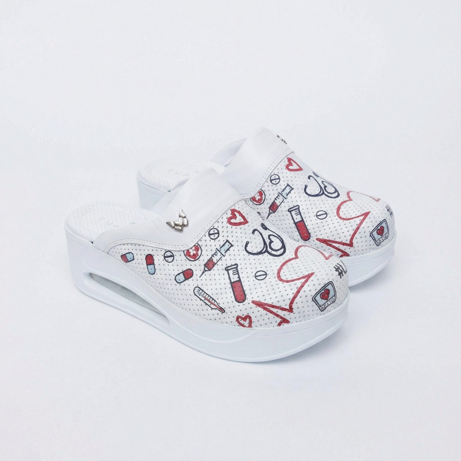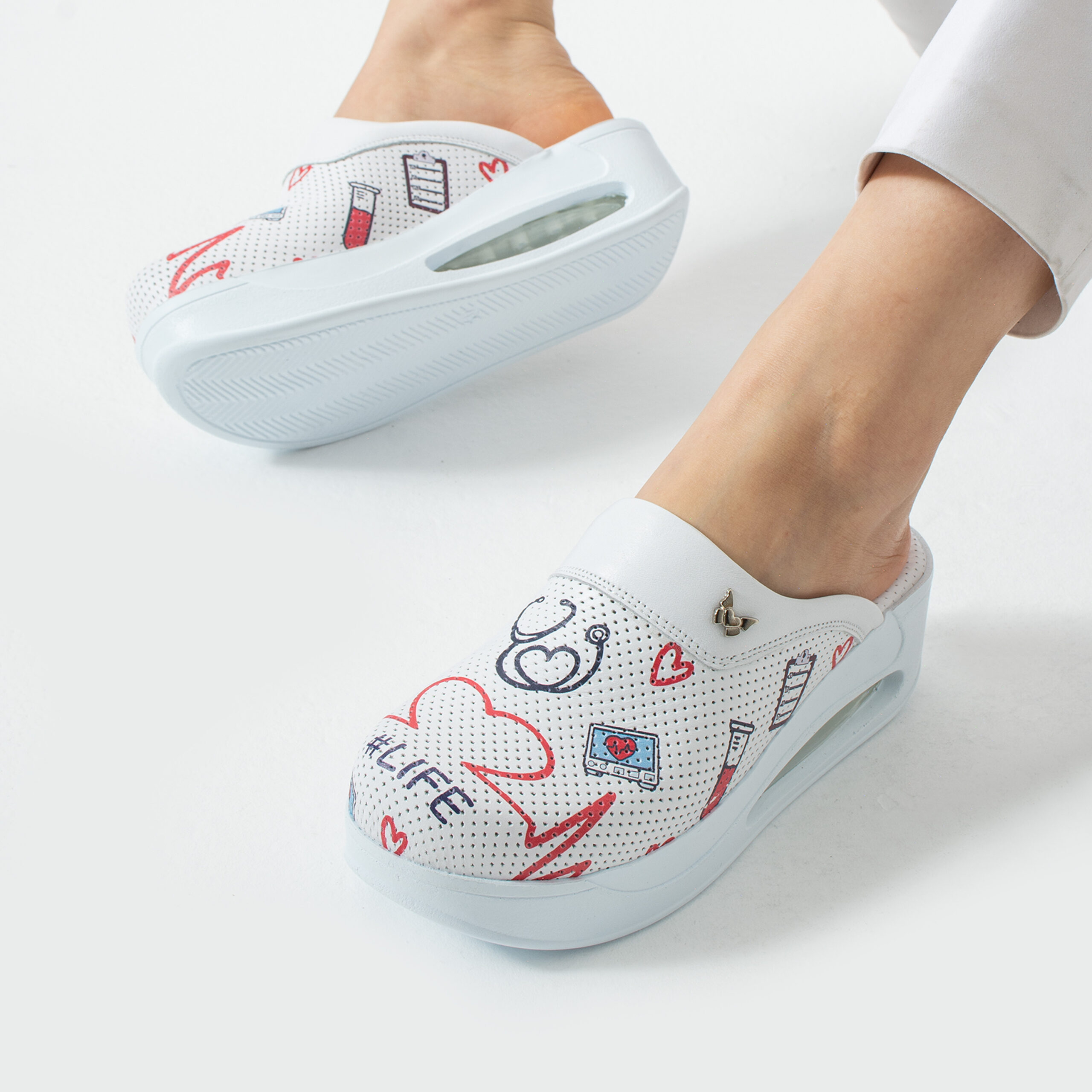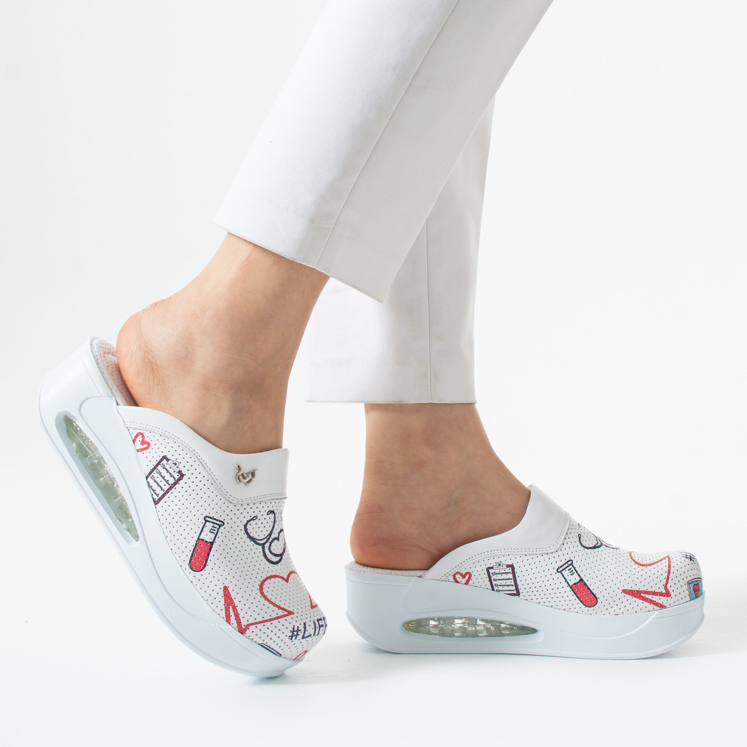 AirForm Classic на TUASOLEA са удобни и качествени анатомични медицински чехли на платформа, изработени изцяло от естествена кожа. Белият цвят с принт Pulse, вдъхновен от ритъма на здравната среда, е съобразен с професионални места като болници и клиники – разпознаваем и тематичен, но без да стои натрапчиво.