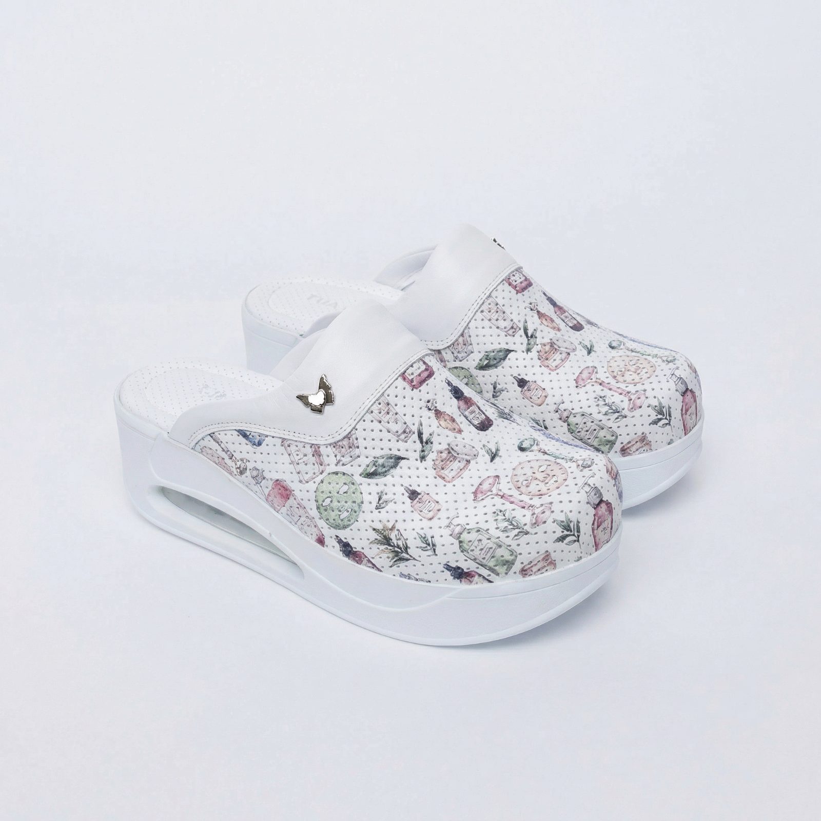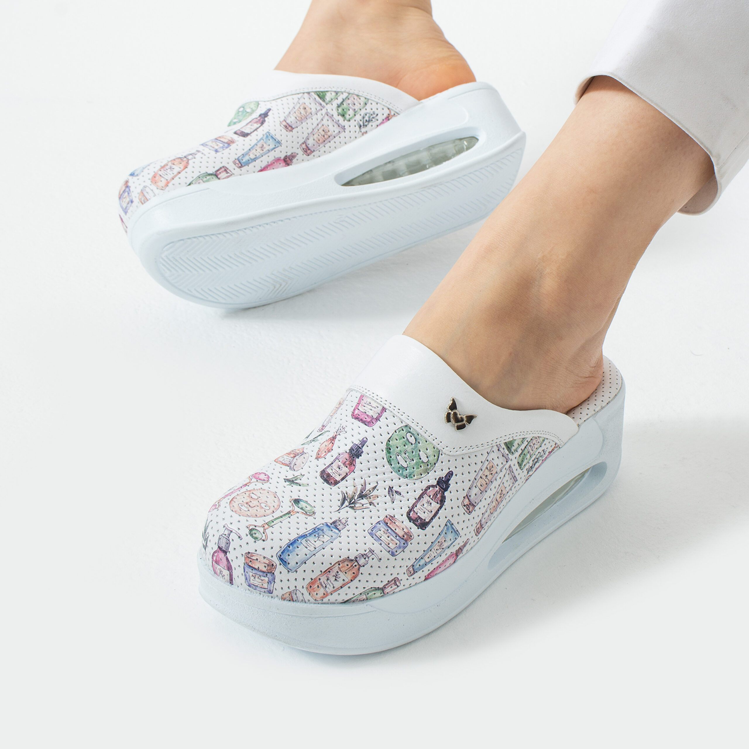 AirForm Classic на TUASOLEA са комфортни и качествени анатомични работни чехли на платформа, направени изцяло от естествена кожа. Белият цвят с принт SkinLab им придава подредена и съвременна визия, подходяща за работна среда като козметични салони, дерматологични кабинети и студиа за красота – елегантни, но ненатрапчиви.