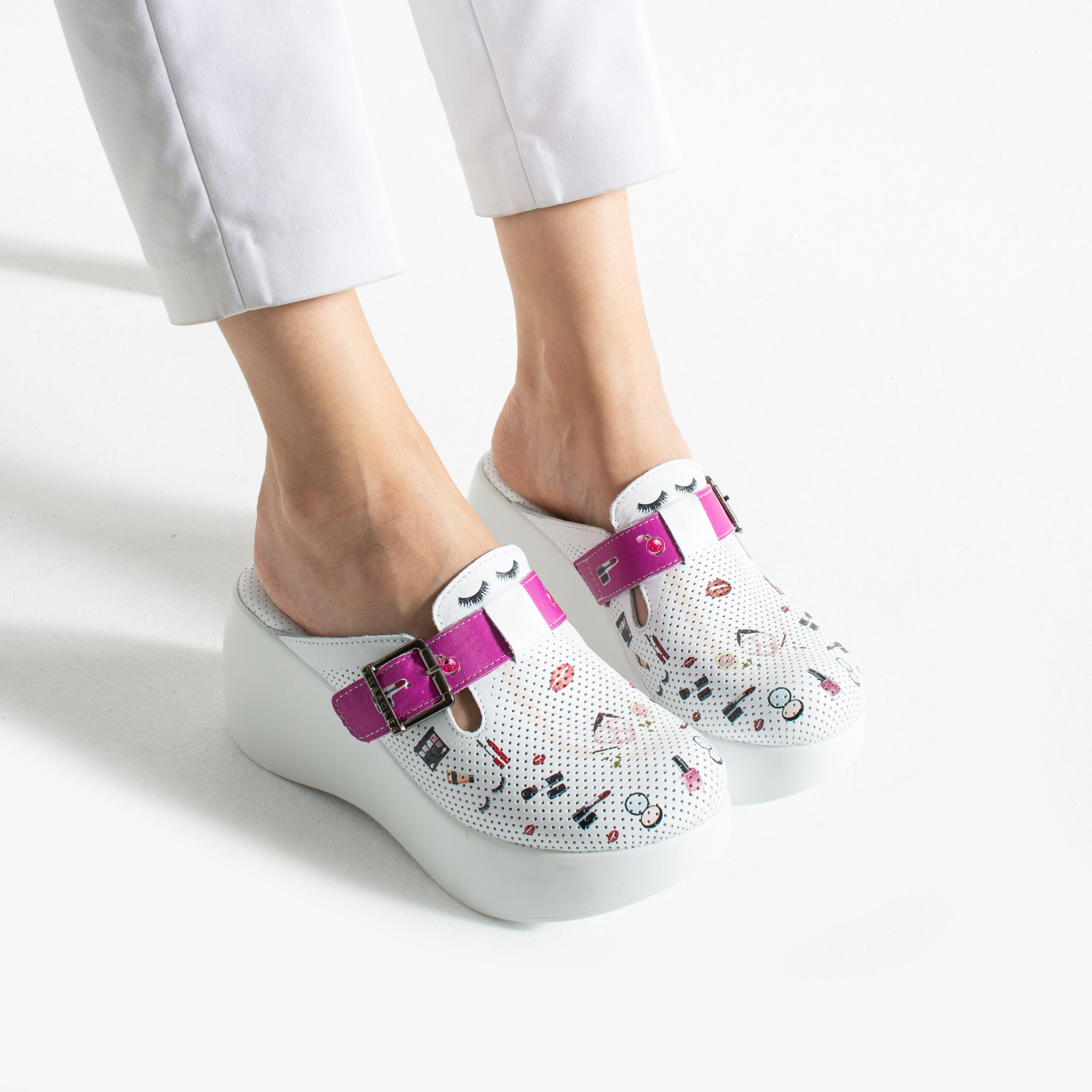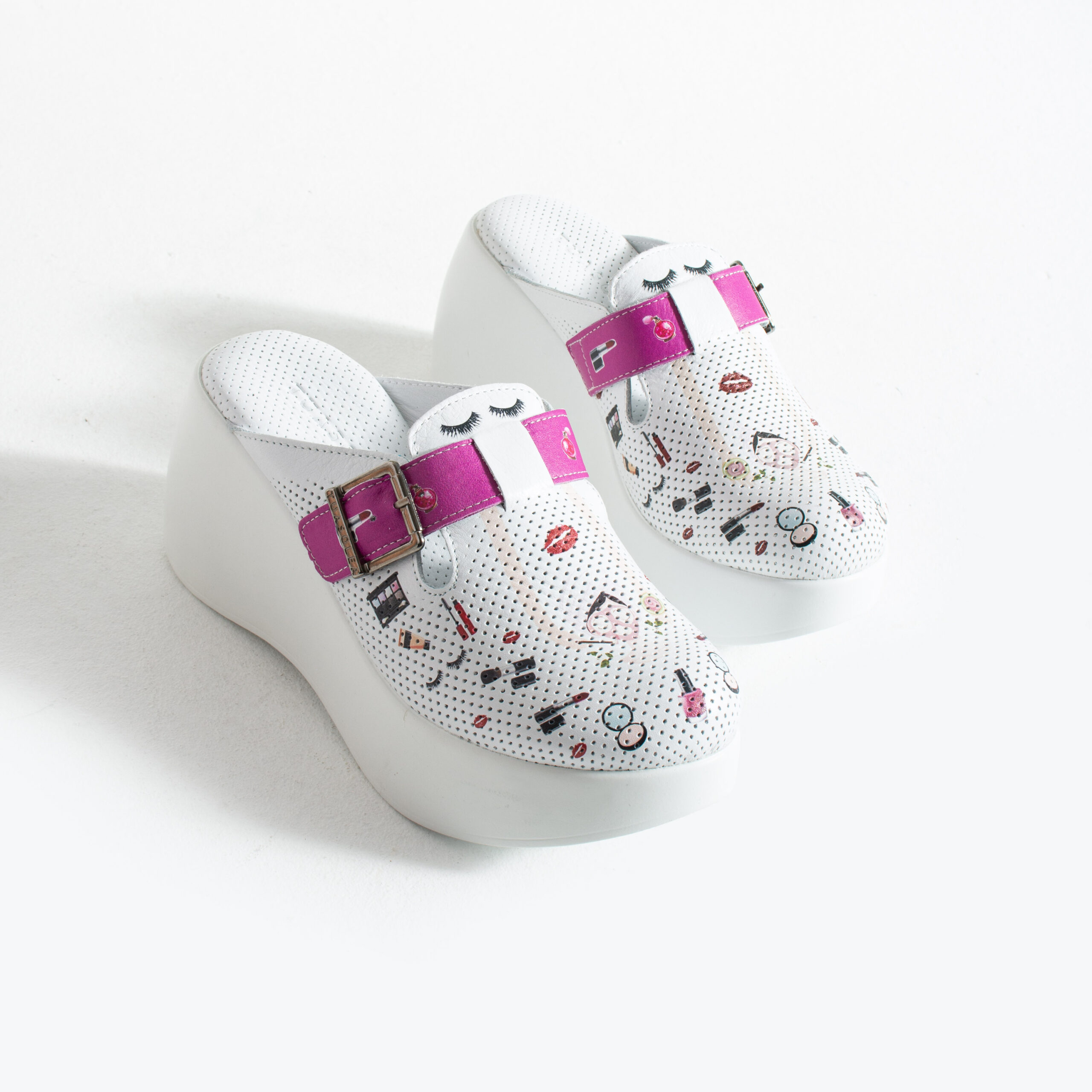 Анатомичните чехли на платформа Beauty са създадени специално за козметици, гримьори и всички професионалисти в салоните за красота, които държат както на стила, така и на комфорта. Изработен от 100% естествена кожа, моделът предлага мекота, дълготрайност и отлично прилягане към стъпалото. Перфорираната горна част спомага за ефективна циркулация на въздуха, което предотвратява запарване при целодневно носене. Тематичният принт с козметични елементи е свеж акцент, който отлично се вписва в атмосферата на студиа и салони за красота.