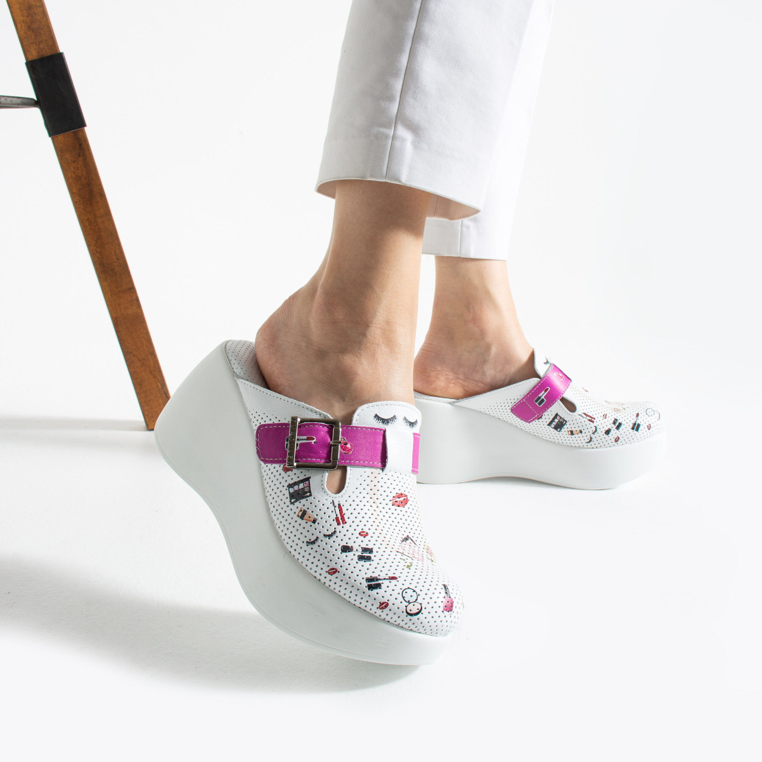 Бели анатомични чехли на платформа за естетични салони от естествена кожа