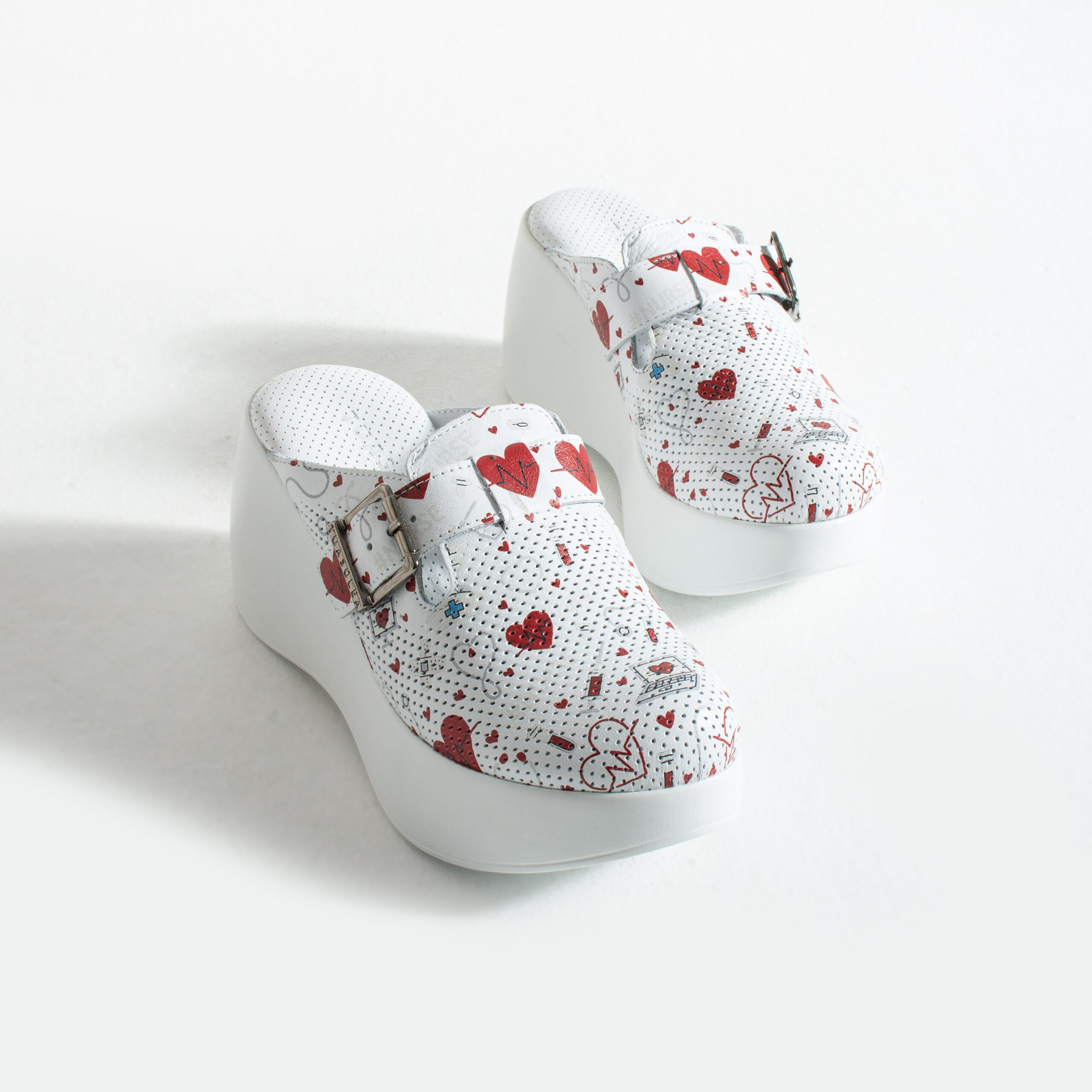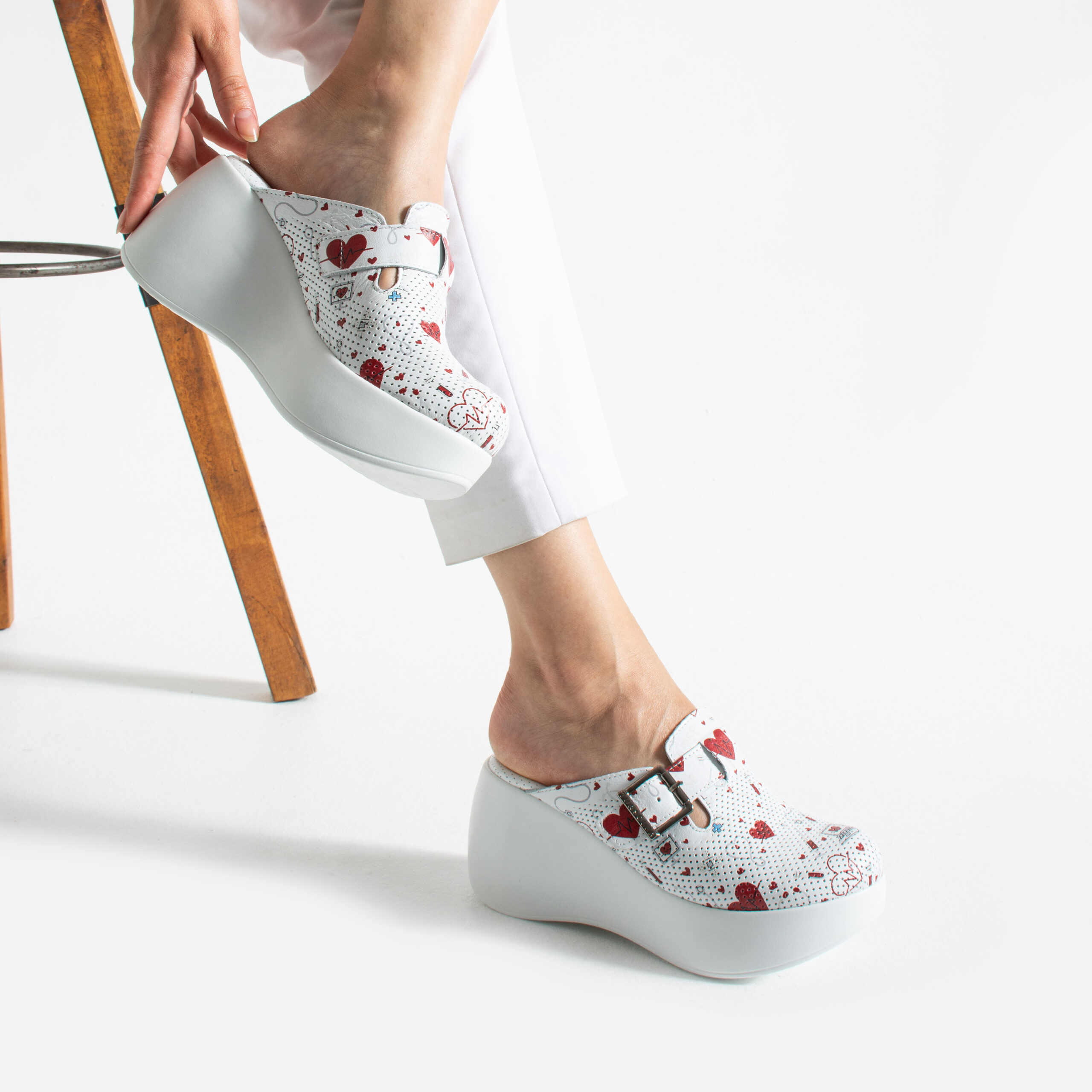 Анатомичните чехли на платформа Brave са създадени за жени, които не правят компромис с комфорта, дори когато държат на женствената визия. Изработени от 100% естествена кожа, те осигуряват мекота, дълготрайност и адаптивност към формата на крака. Перфорираната горна част подпомага добрата циркулация на въздуха, за да се избегне запарване, а тематичният принт в червено подчертава професионалния и грижовен облик на работещите в сферата на здравеопазването.