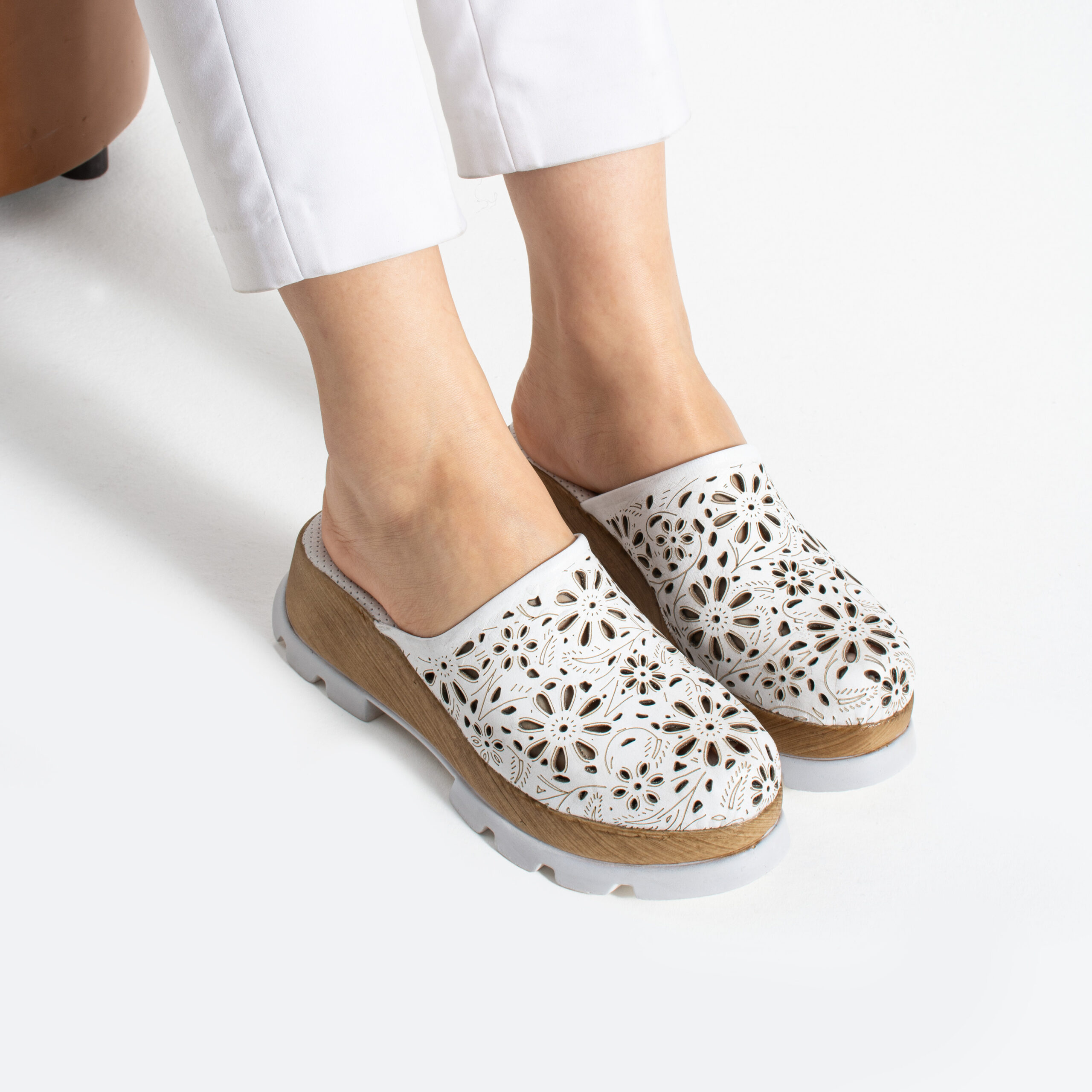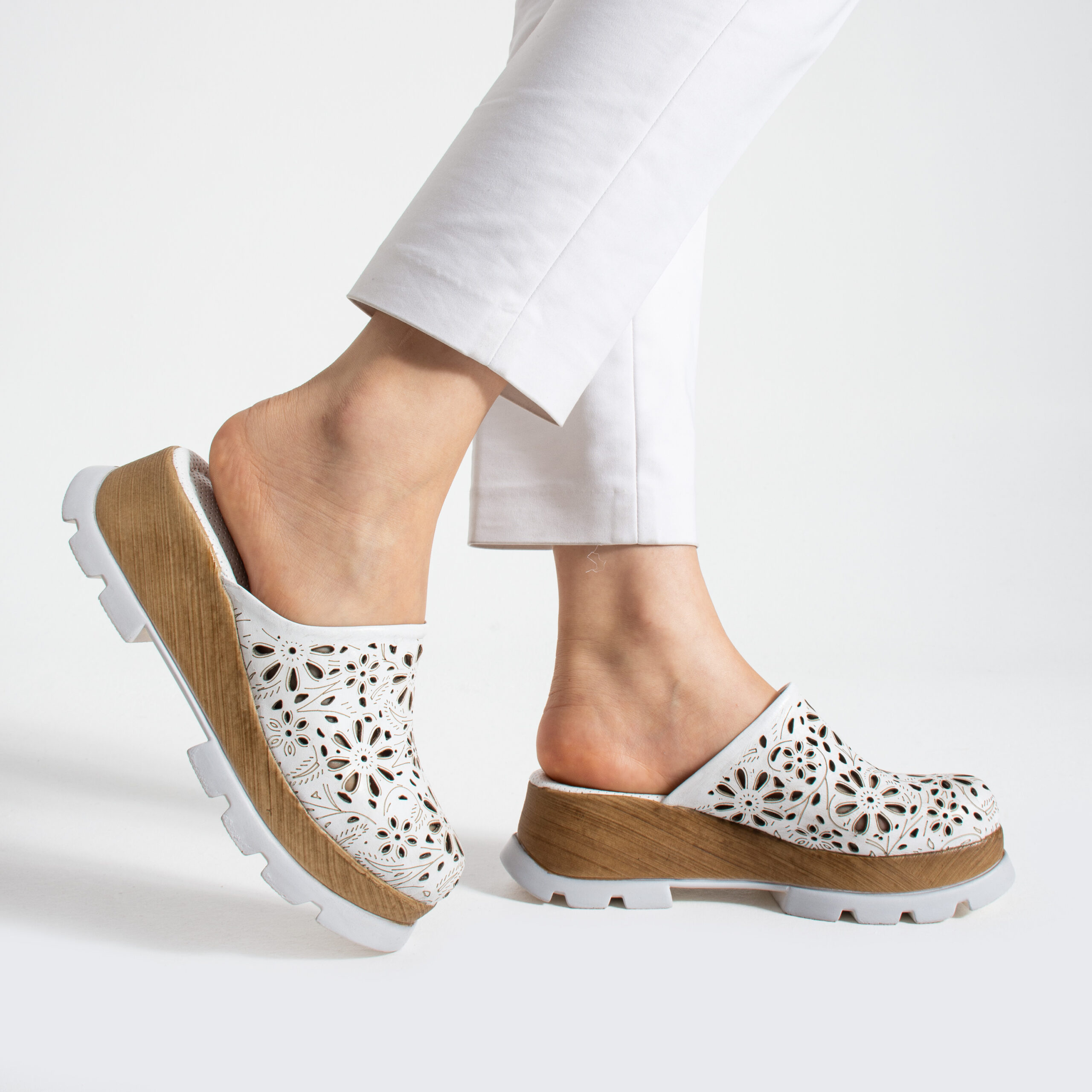 Бяло дамско сабо от естествена кожа на платформа