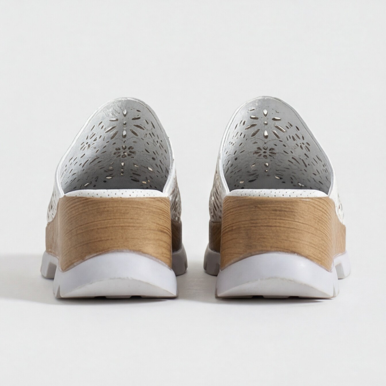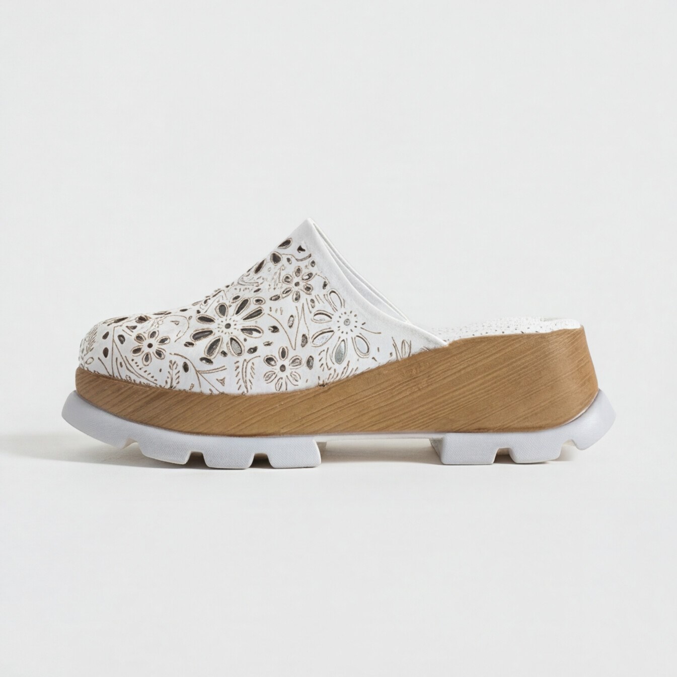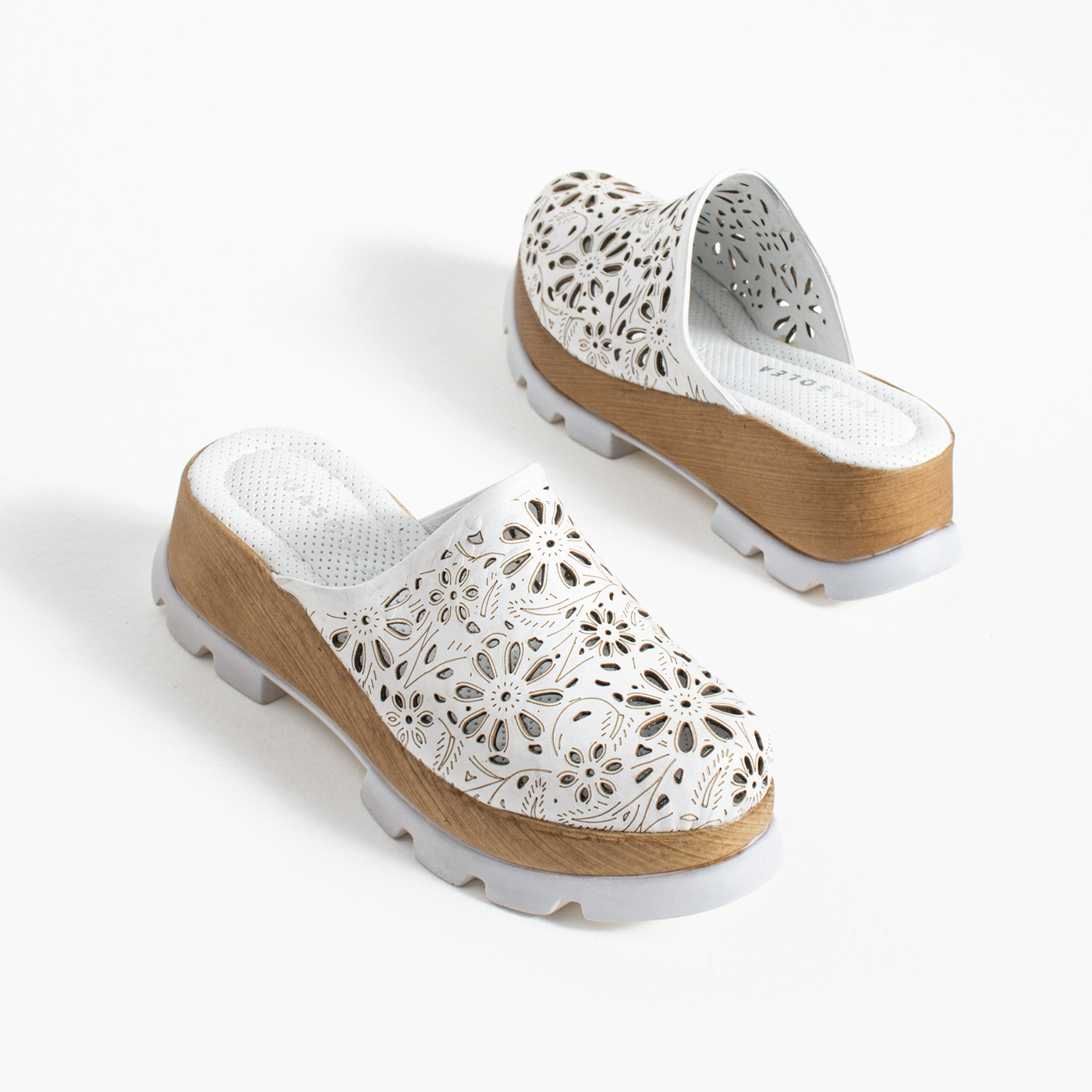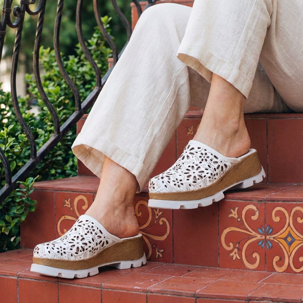 Затвореният отпред силует му дава изчистен и елегантен вид, а естествената кожа с едра флорална перфорация добавя характер и помага на крака да диша в топлите дни. Материалът е мек и ляга приятно по ходилото, без да стяга. Омекотената и перфорирана стелка прави всяка стъпка по-комфортна, а широката основа на подметката носи стабилност и усещане за лекота. Дървесният ефект е съчетан с цвета на модела и подчертава завършения му вид.
