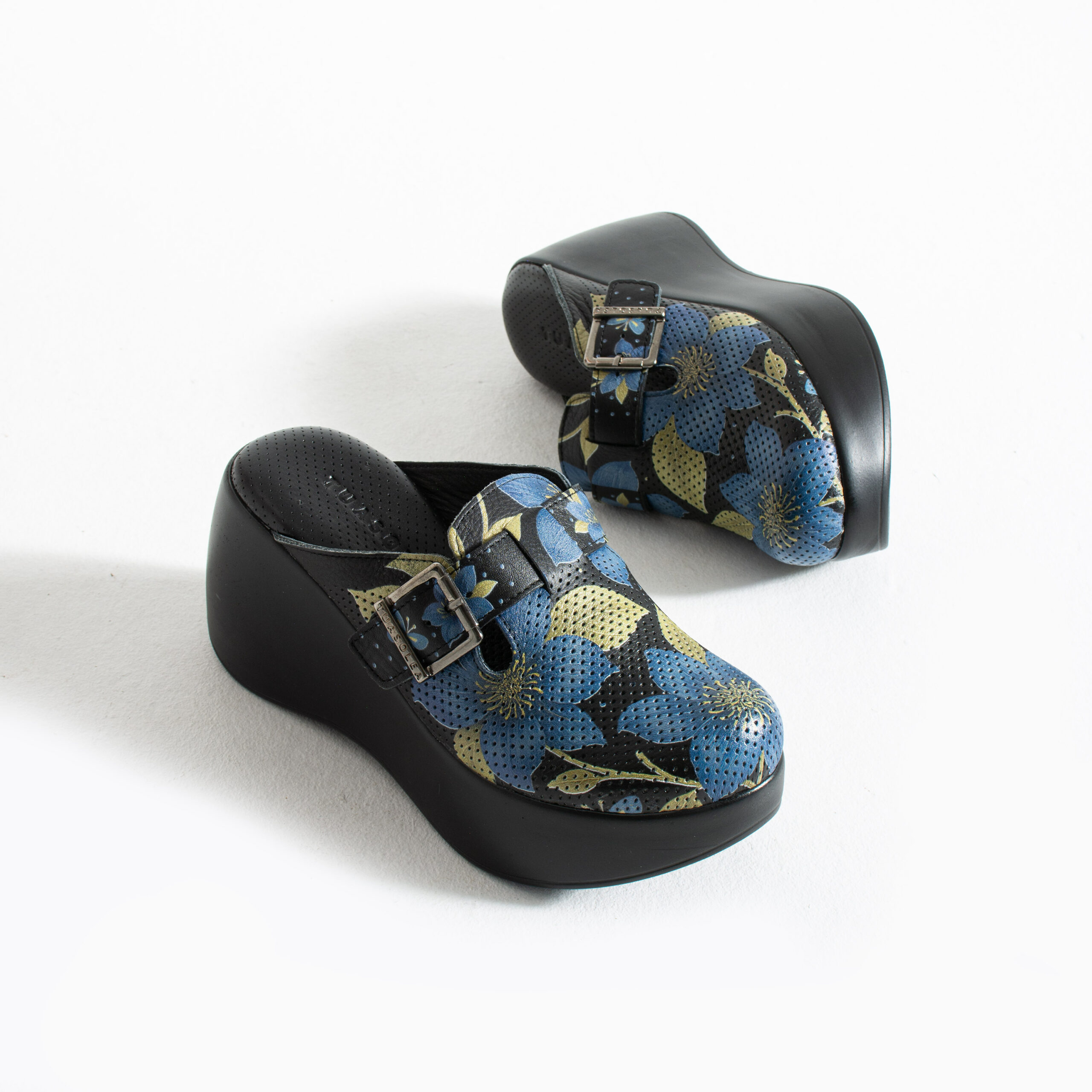 Дамските анатомични чехли на платформа Gold Lilium впечатляват с наситен флорален дизайн и стилна черна основа, което ги прави чудесен избор както за работна, така и за ежедневна среда. Изработен от 100% естествена кожа, моделът осигурява комфорт, мекота и устойчивост при продължително носене, като се адаптира към формата на стъпалото. Перфорираната горна част позволява постоянна циркулация на въздуха, за да се избегне запарване, а флоралният принт в синьо и златисто придава изразен и елегантен характер.