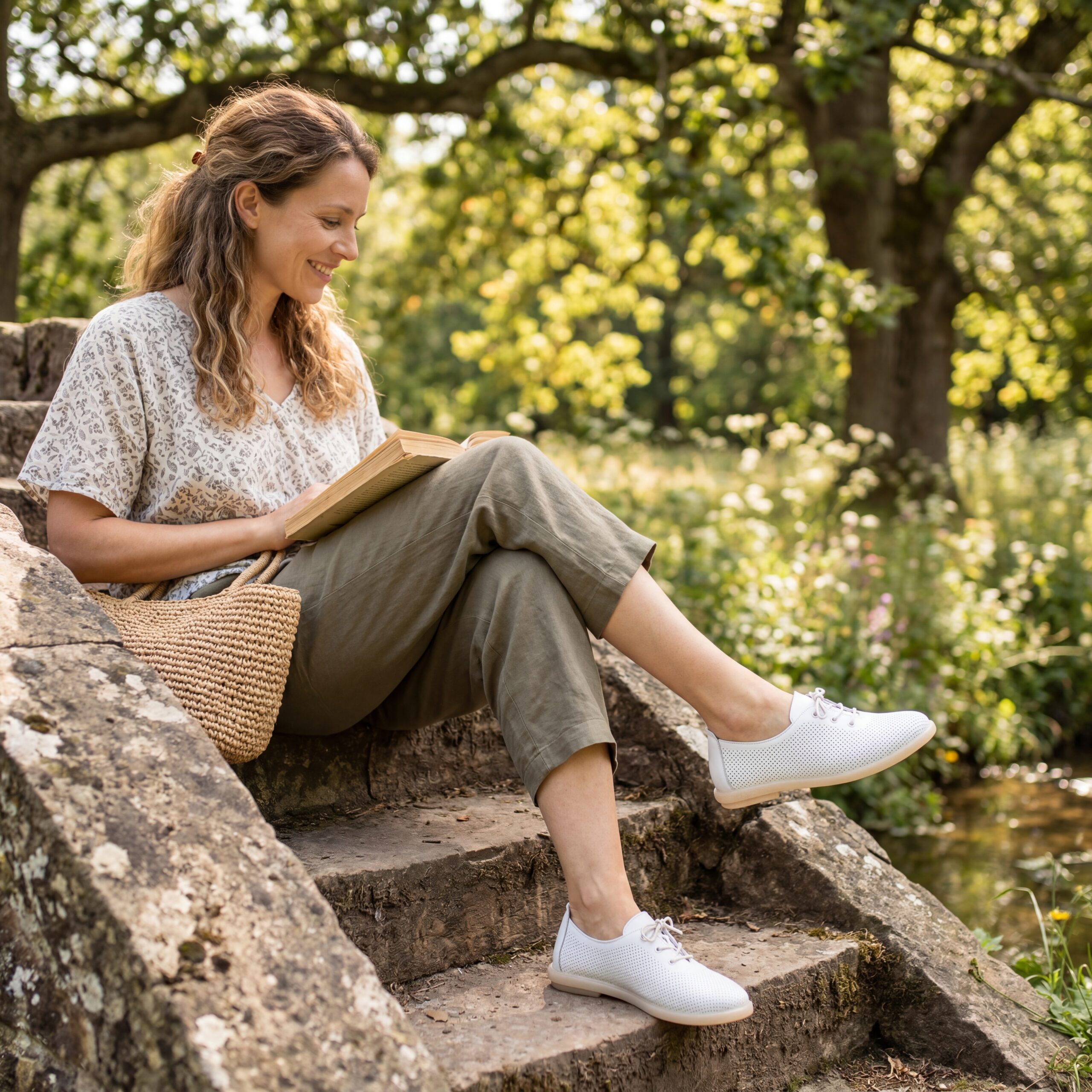 Горната част от 100% естествена кожа с фина перфорация помага на стъпалото да диша и ограничава запарването през пролетно-летния сезон. Материалът е мек и с времето се напасва към формата на ходилото. По-широката предна част дава достатъчно място на пръстите, без усещане за стягане. Еластичните връзки улесняват обуването и допринасят за по-добро прилягане.