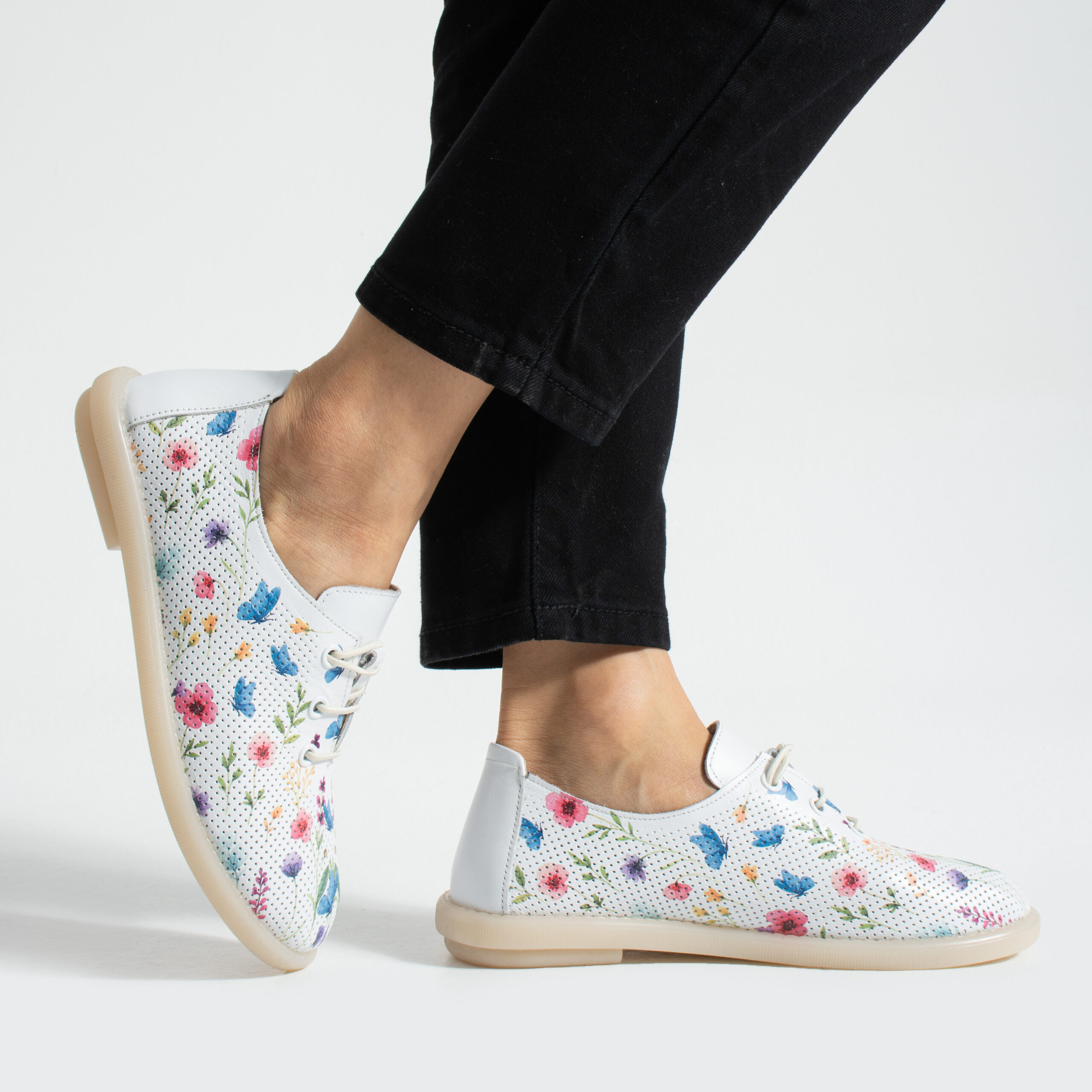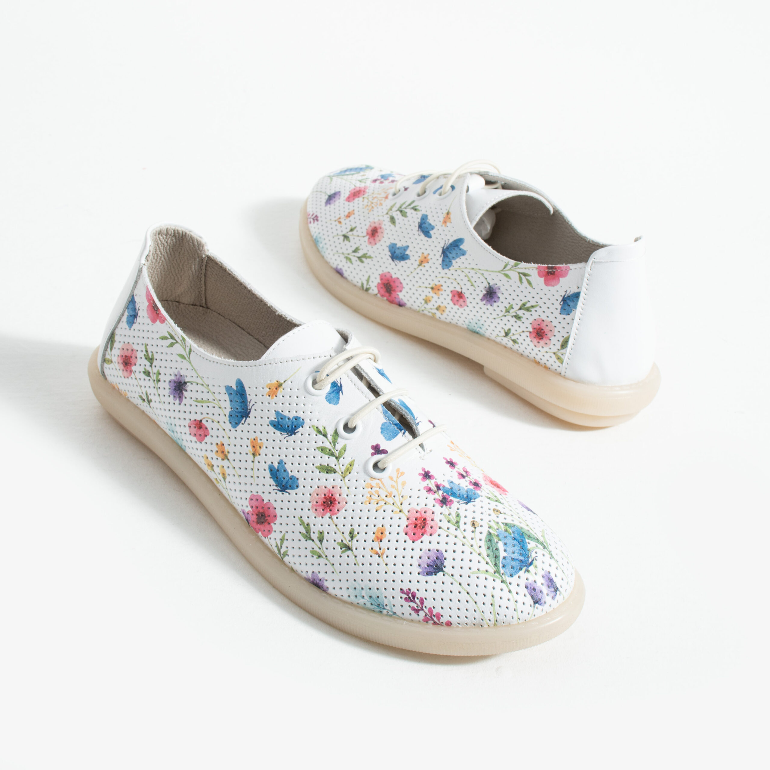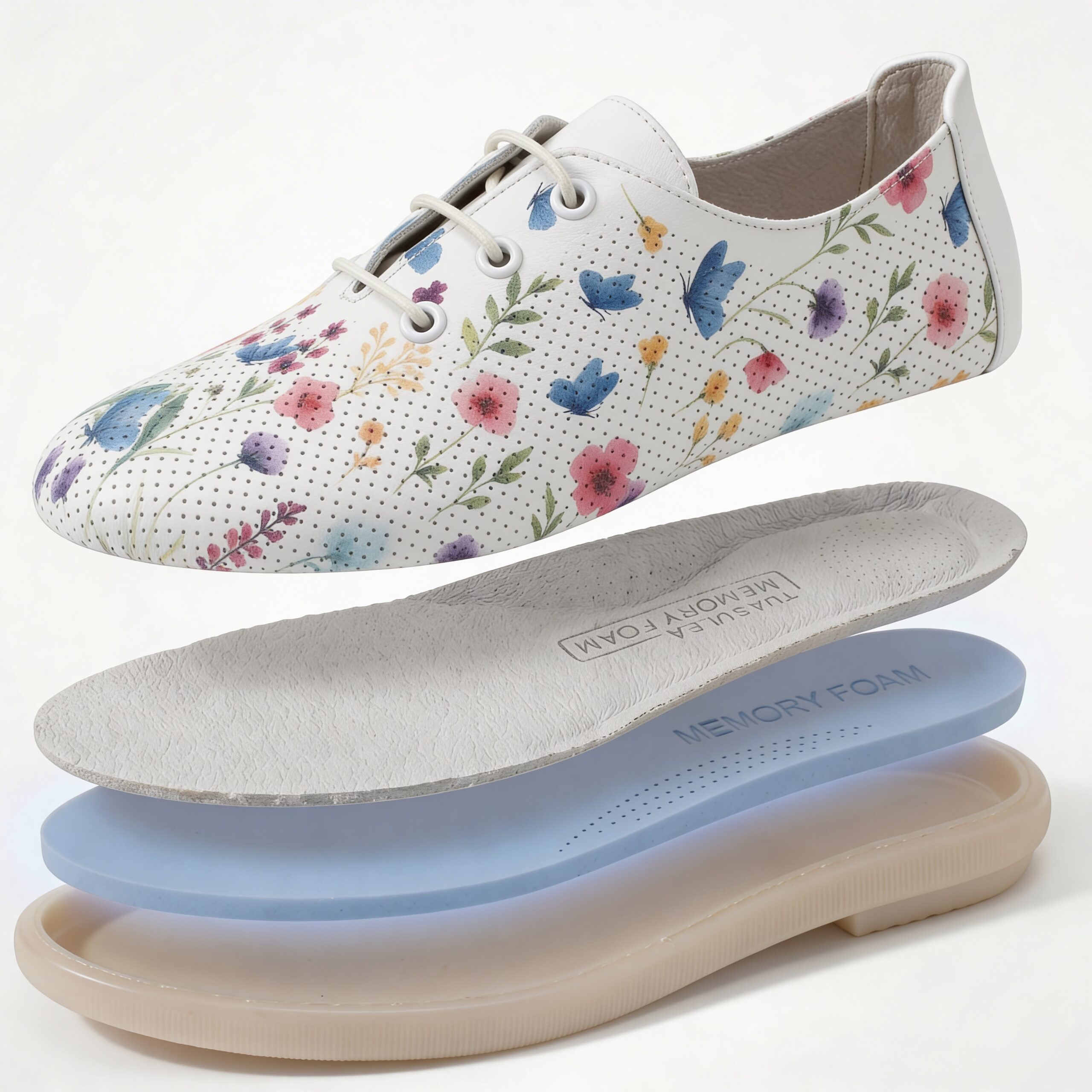 TUASOLEA Memory Lite са дамски обувки от естествена кожа, създадени с мека анатомична стелка с мемори пяна за дни, в които прекарваш много време на крак и държиш най-вече на удобството. Основата в бял цвят е допълнена с ефирен цветен флорален принт в нежни нюанси на синьо, розово, лилаво и жълто, който придава свеж и женствен вид, подходящ както за ежедневието, така и за по-спортно-елегантни визии.