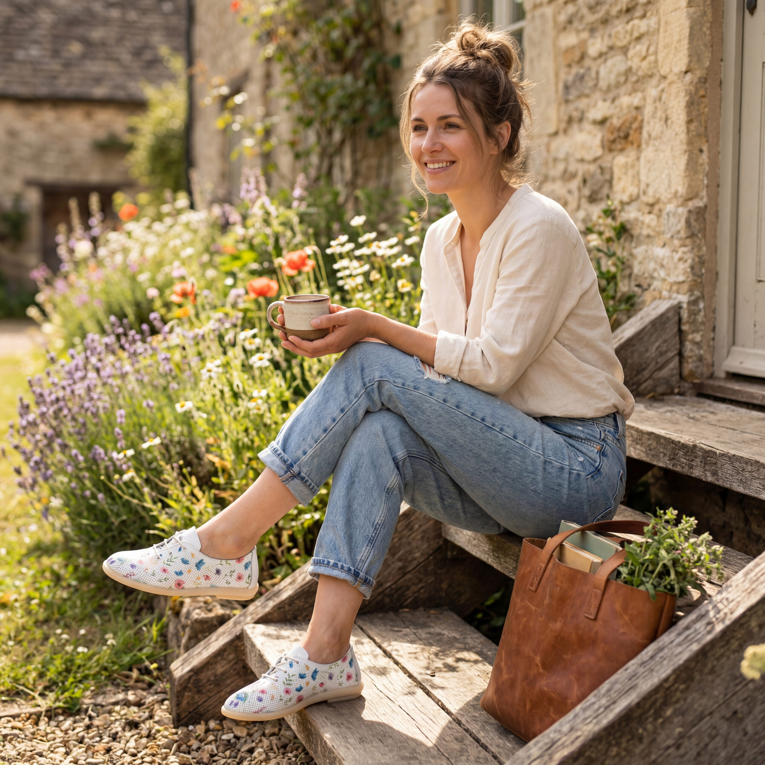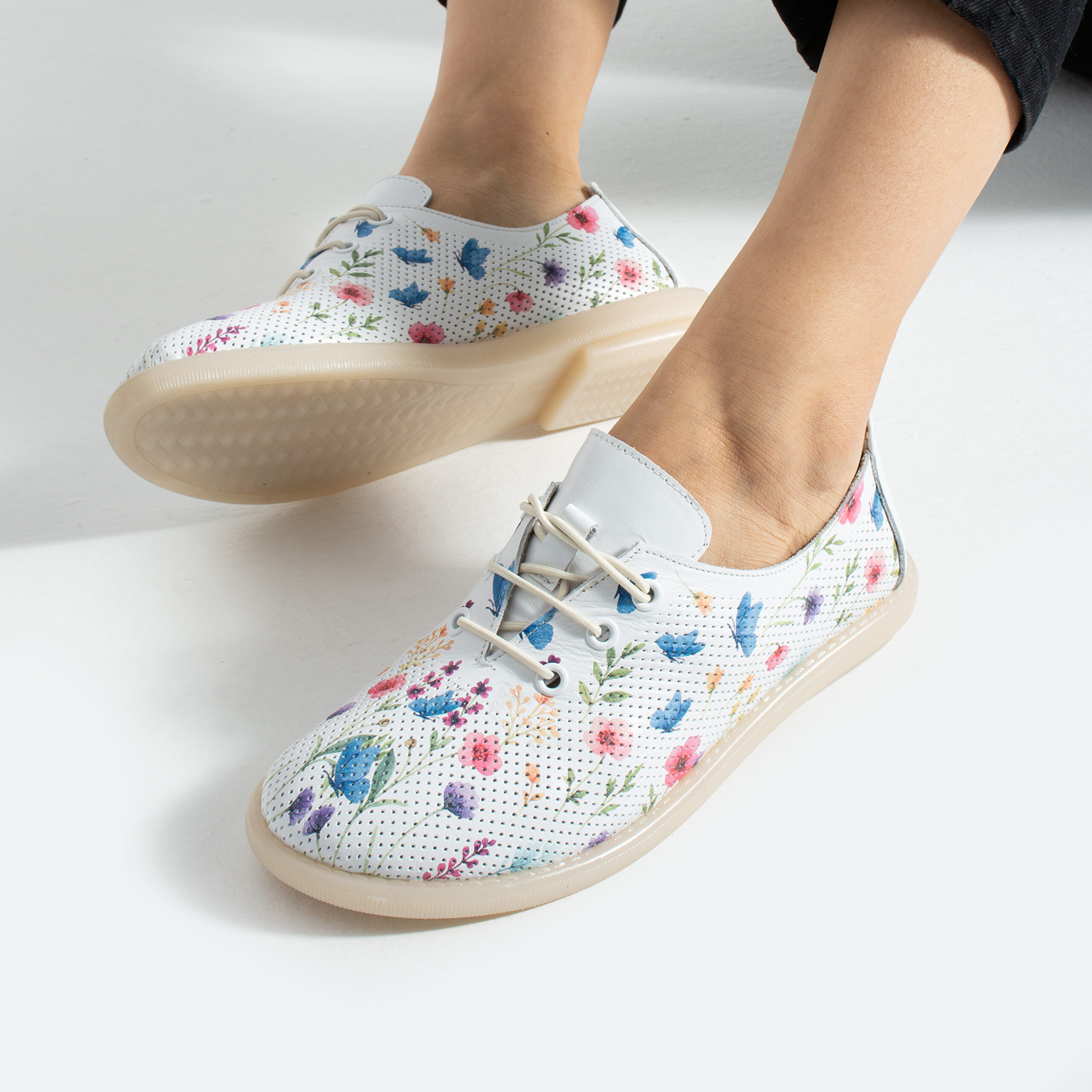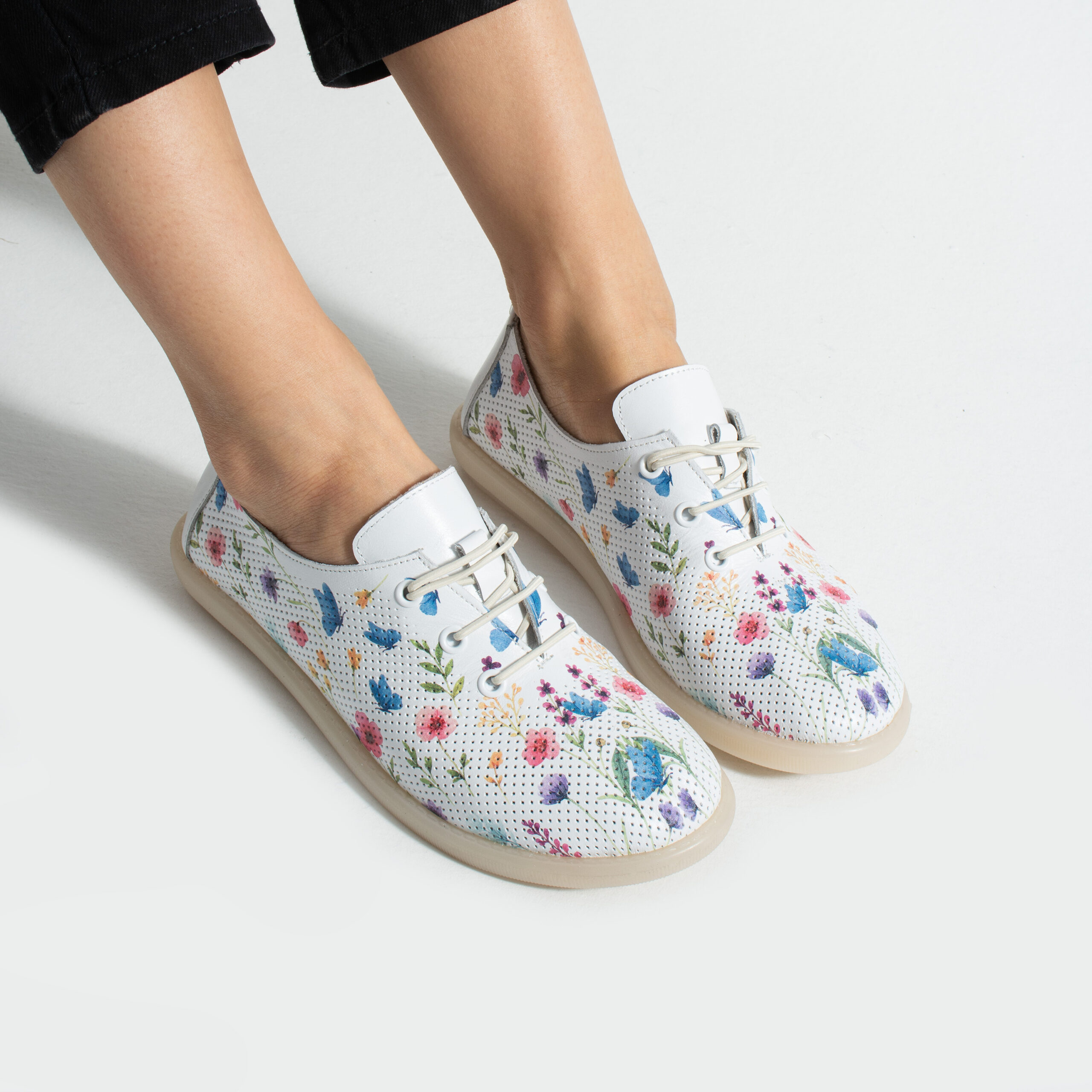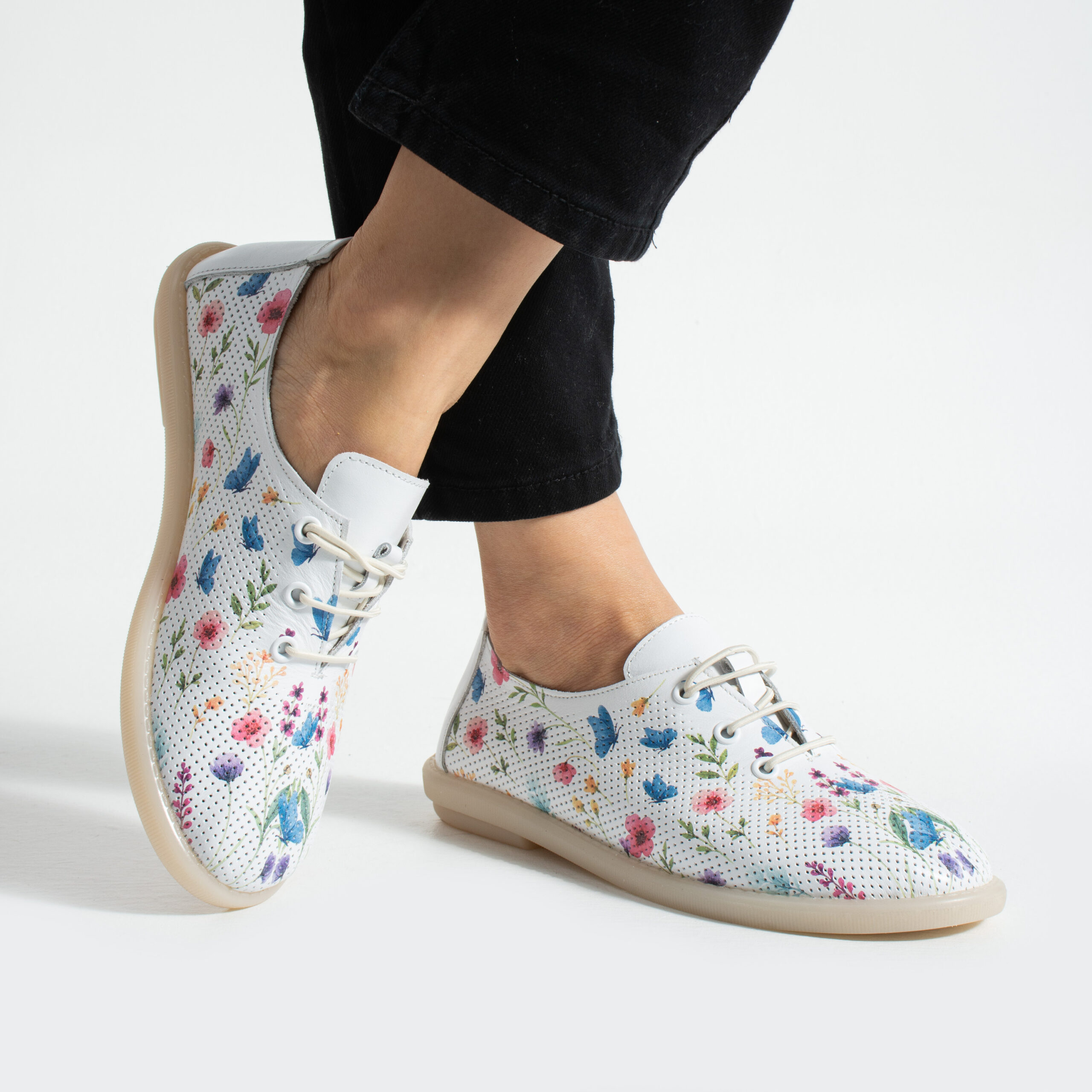 TUASOLEA Memory Lite са дамски обувки от естествена кожа, създадени с мека анатомична стелка с мемори пяна за дни, в които прекарваш много време на крак и държиш най-вече на удобството. Основата в бял цвят е допълнена с ефирен цветен флорален принт в нежни нюанси на синьо, розово, лилаво и жълто, който придава свеж и женствен вид, подходящ както за ежедневието, така и за по-спортно-елегантни визии.
