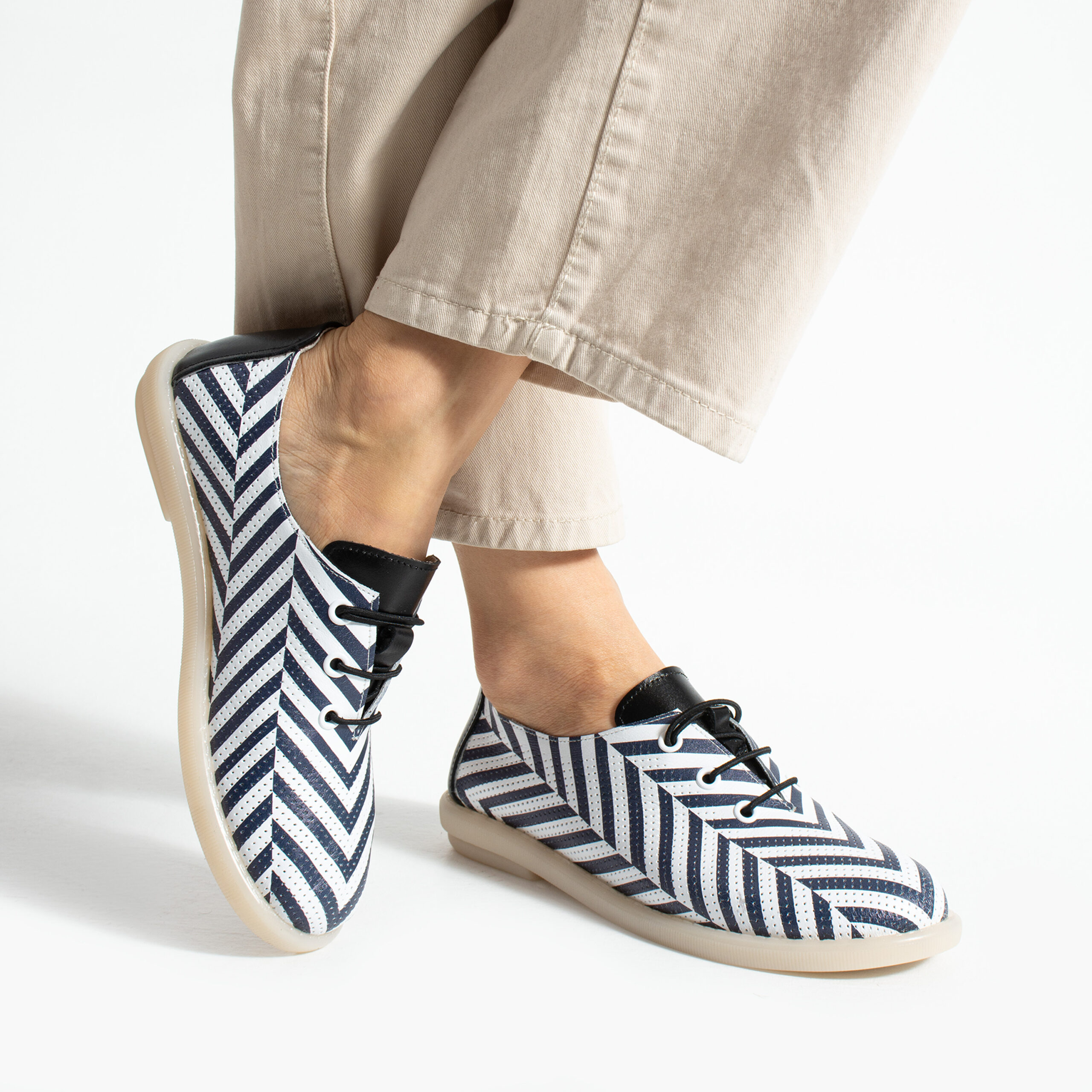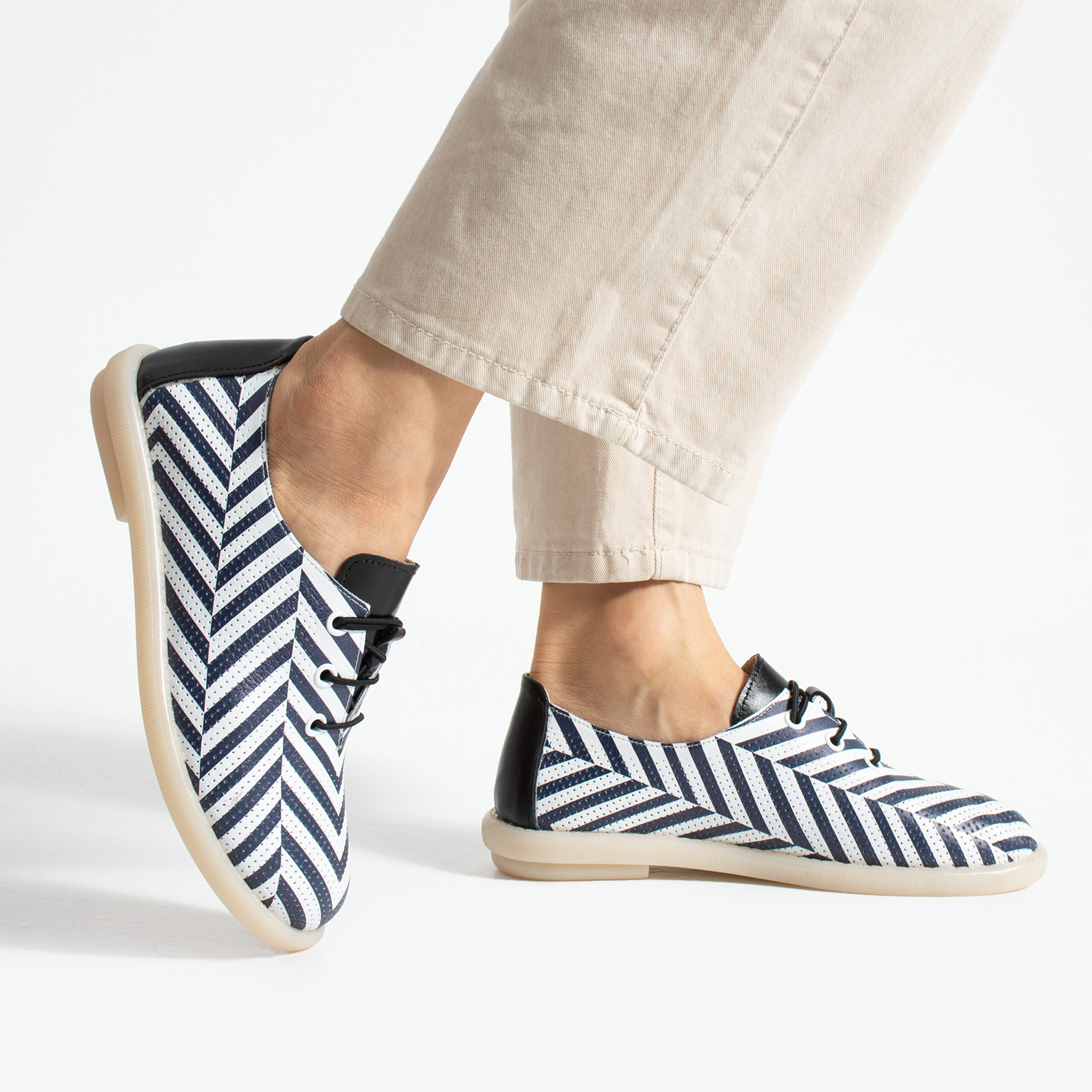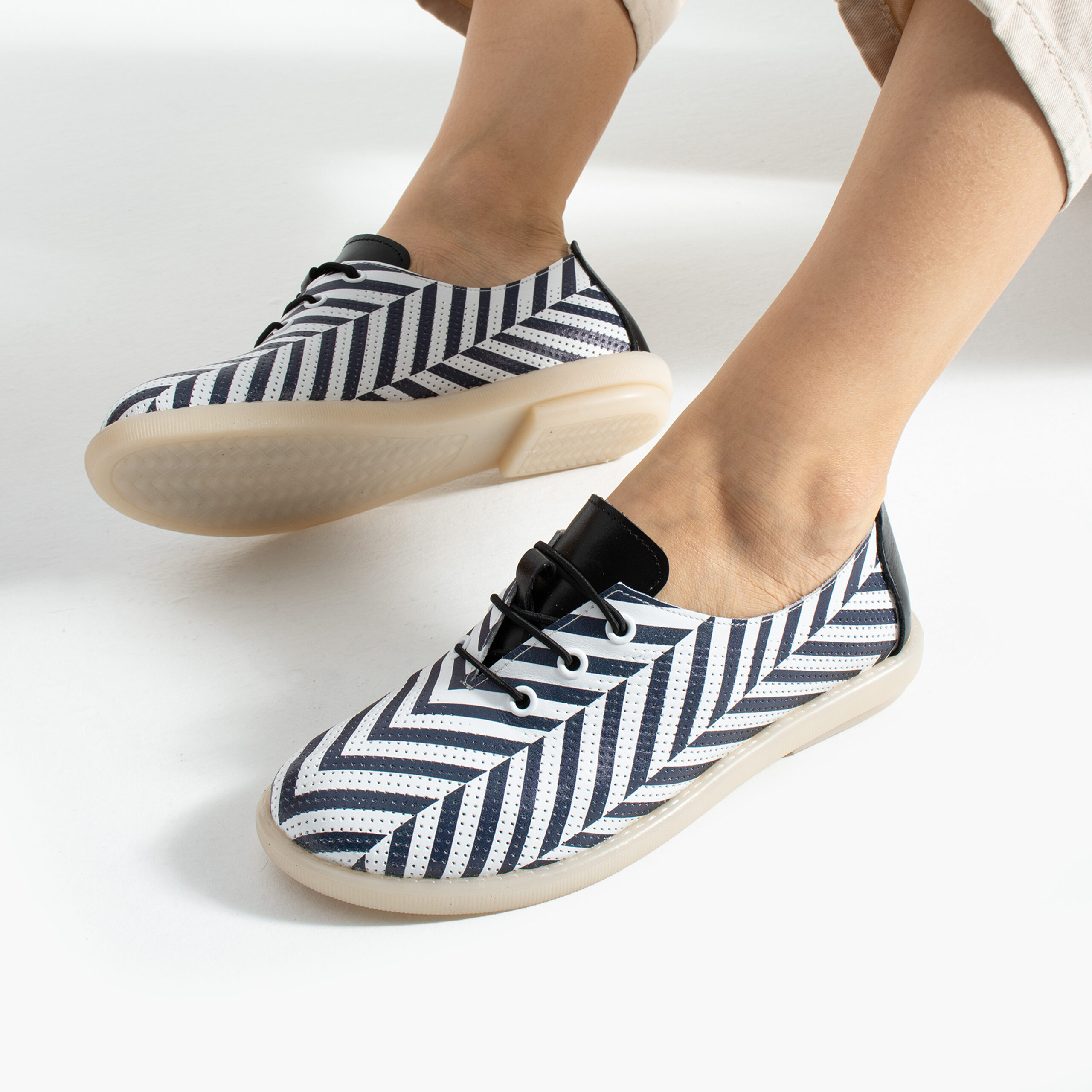 TUASOLEA Memory Lite са дамски обувки от естествена кожа, създадени с мека анатомична стелка с мемори пяна за дни, в които прекарваш много време на крак и държиш най-вече на удобството. Ефектният дизайн с контрастни черно-бели диагонални ивици придава динамичен и модерен вид, който ги прави подходящи както за ежедневието, така и за по-спортно-елегантни визии.