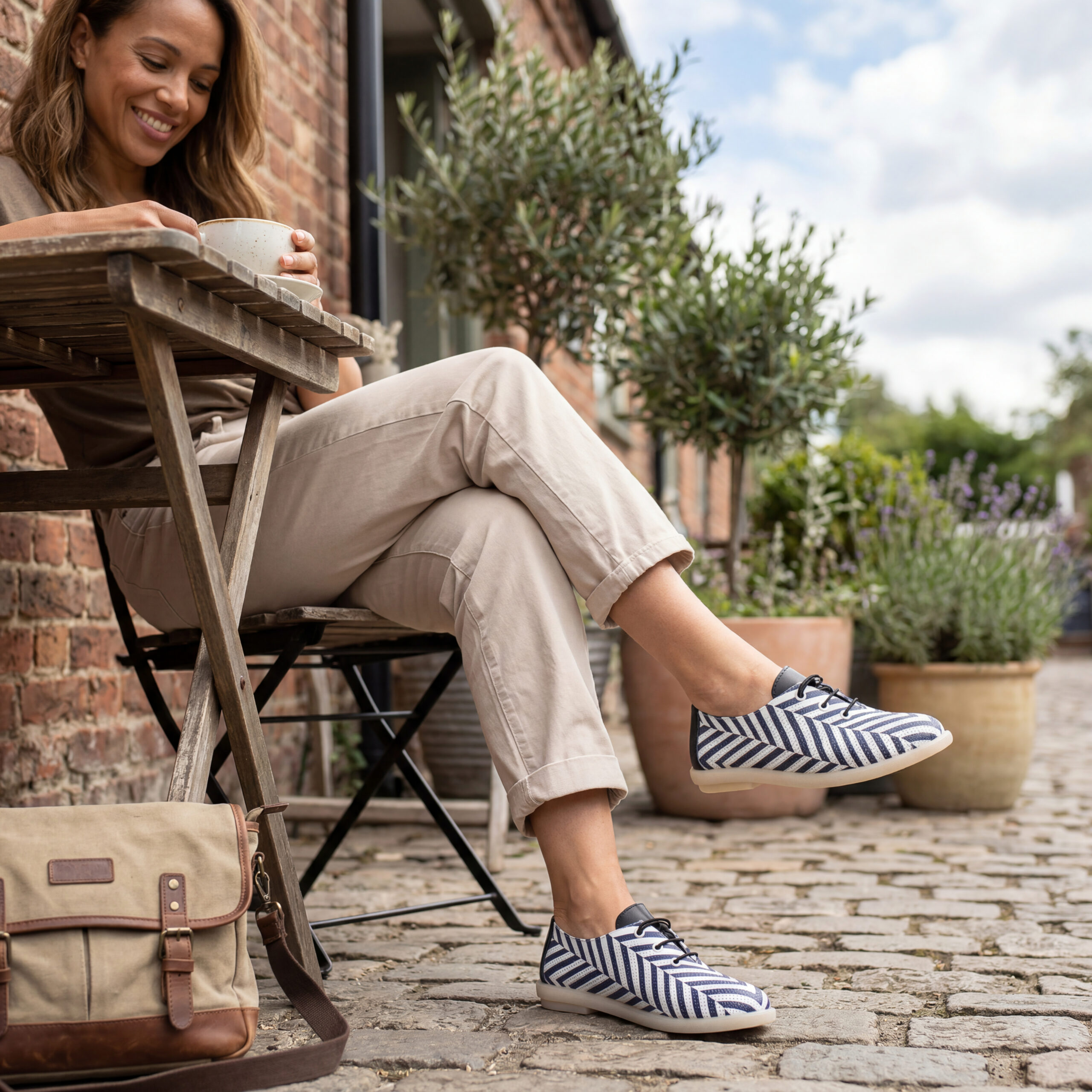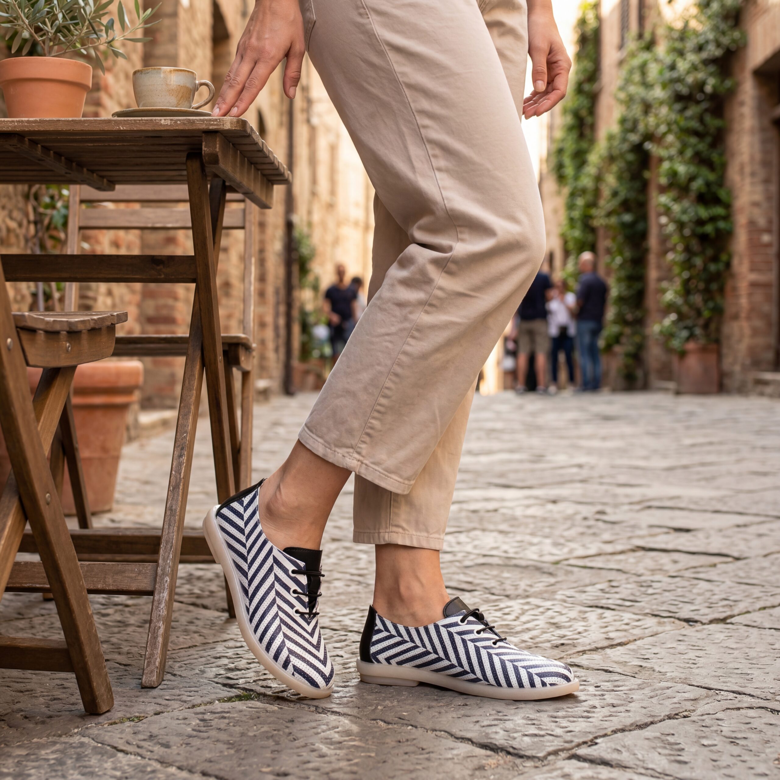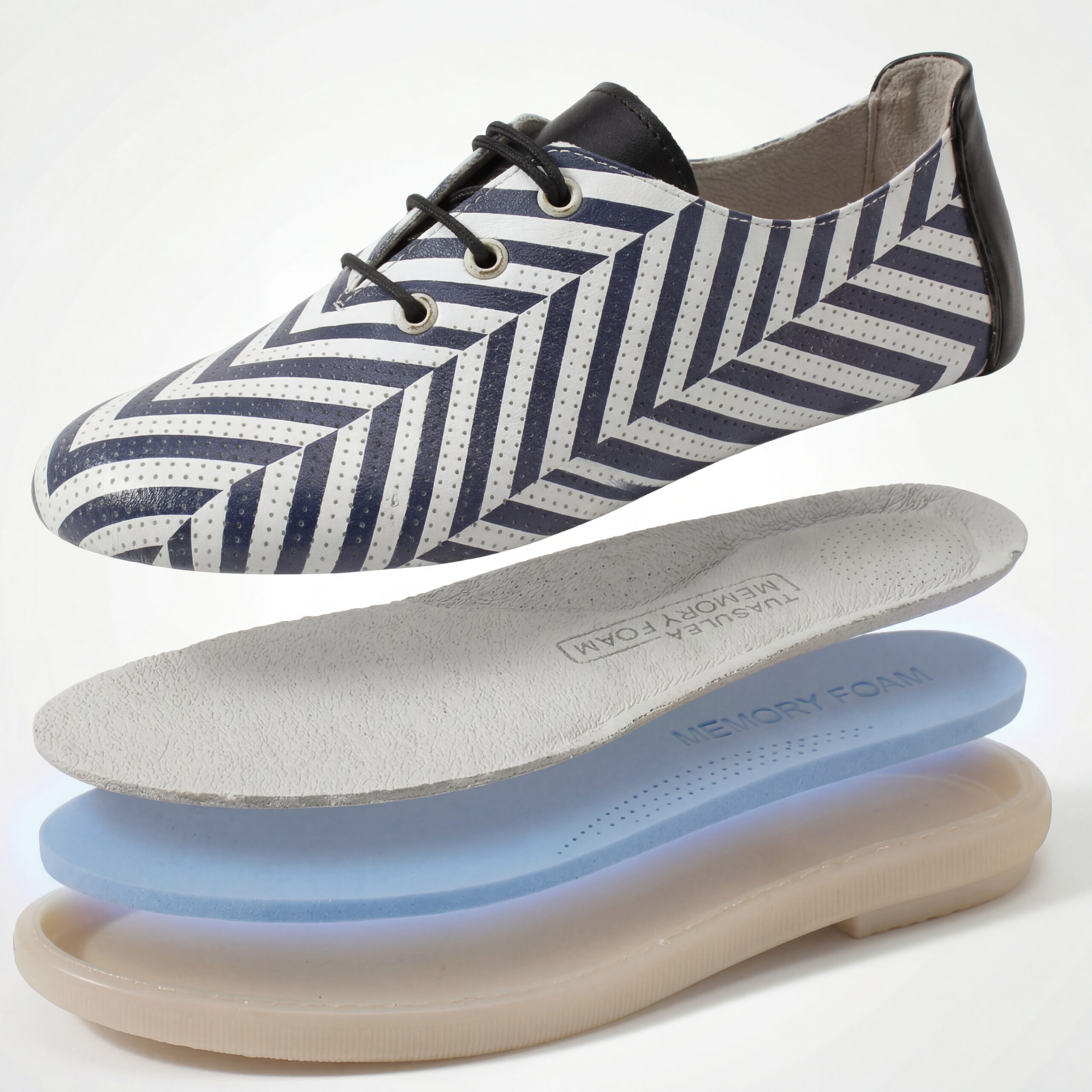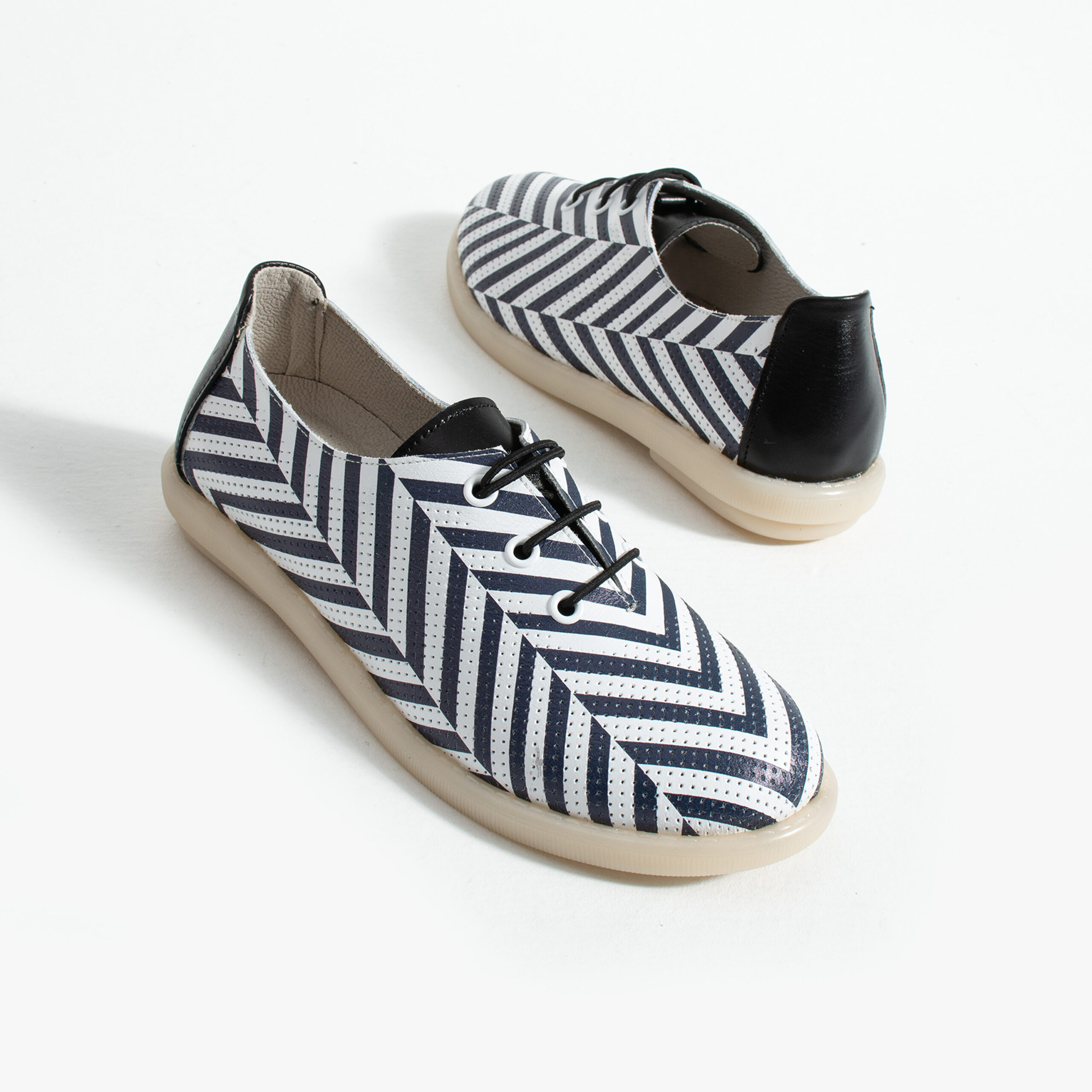 TUASOLEA Memory Lite са дамски обувки от естествена кожа, създадени с мека анатомична стелка с мемори пяна за дни, в които прекарваш много време на крак и държиш най-вече на удобството. Ефектният дизайн с контрастни черно-бели диагонални ивици придава динамичен и модерен вид, който ги прави подходящи както за ежедневието, така и за по-спортно-елегантни визии.