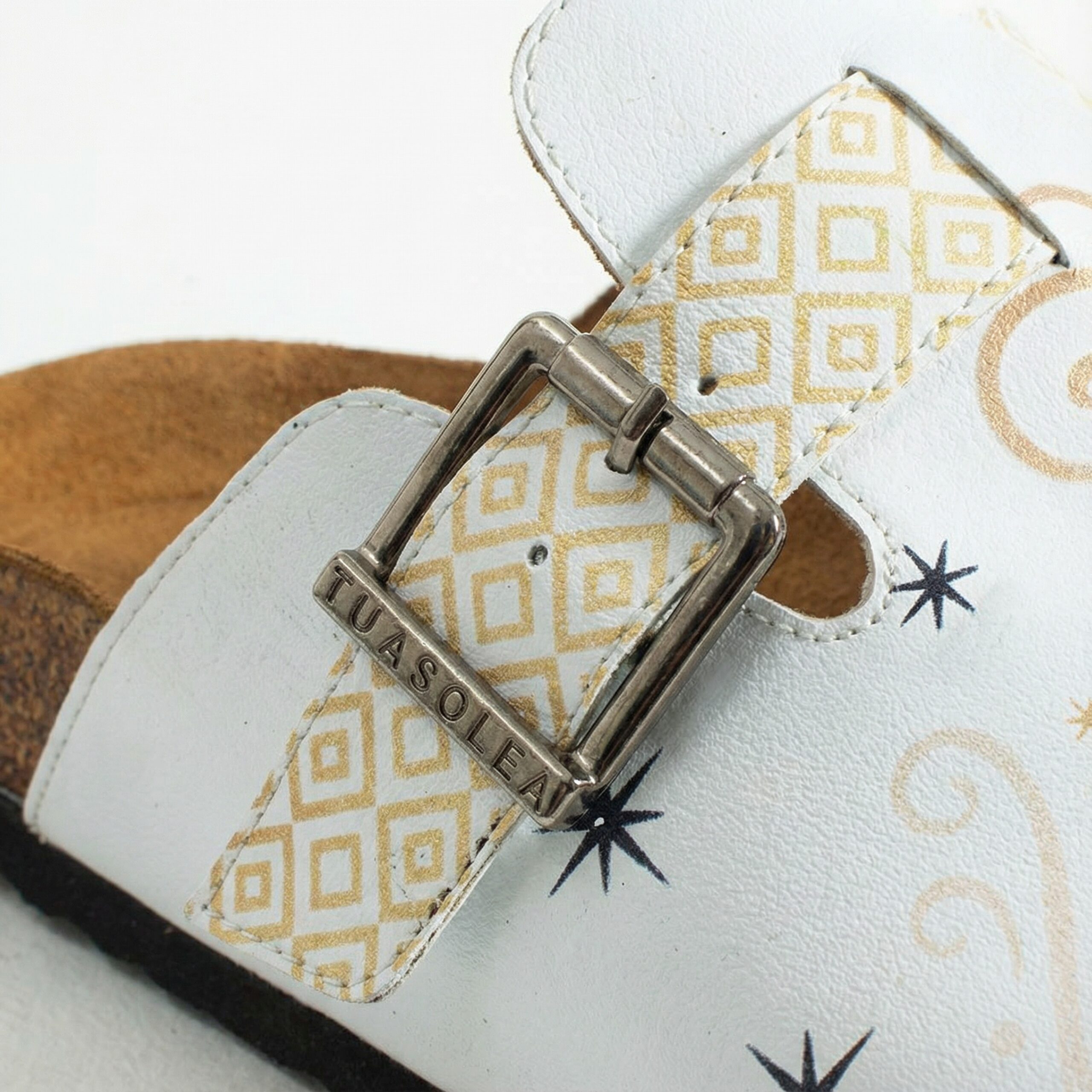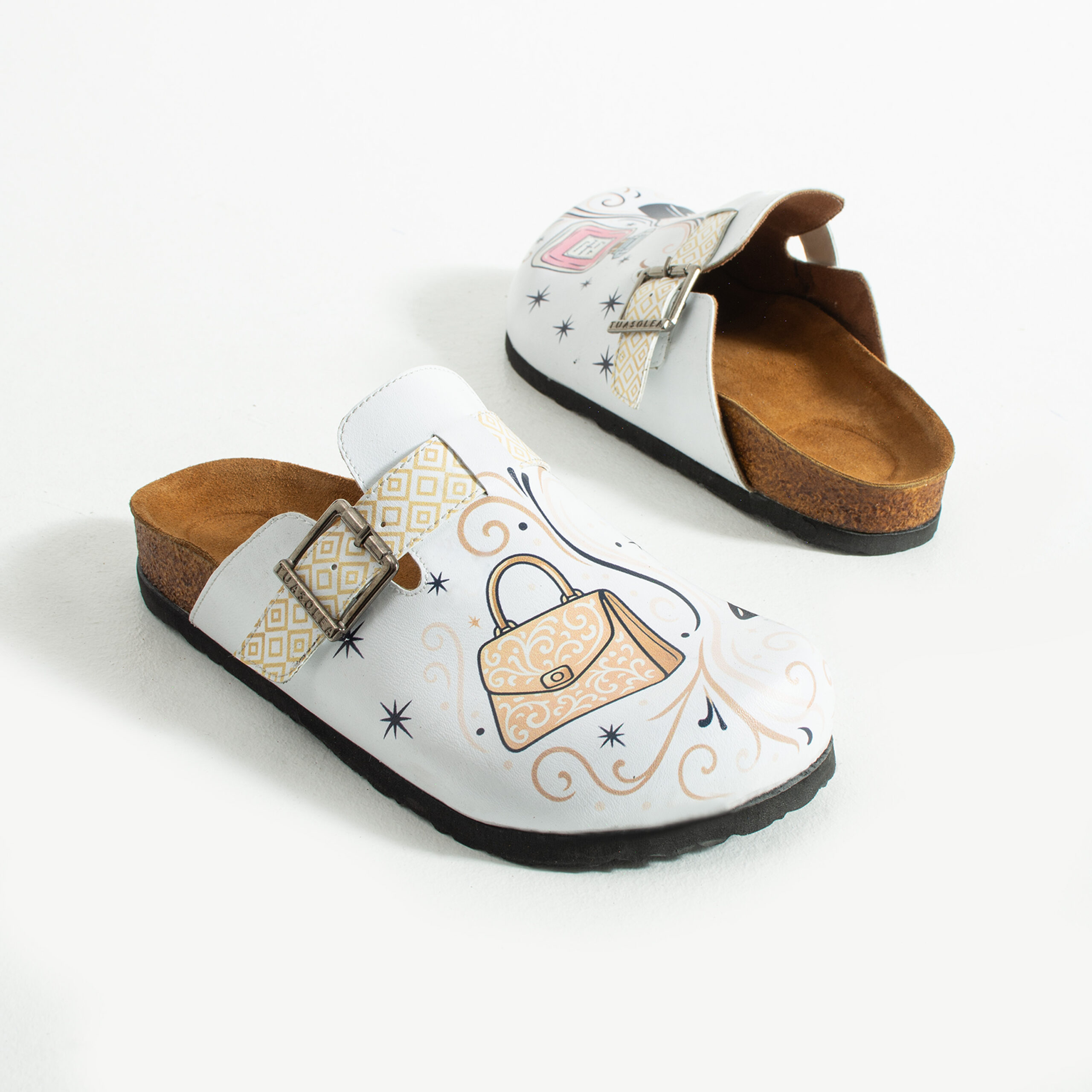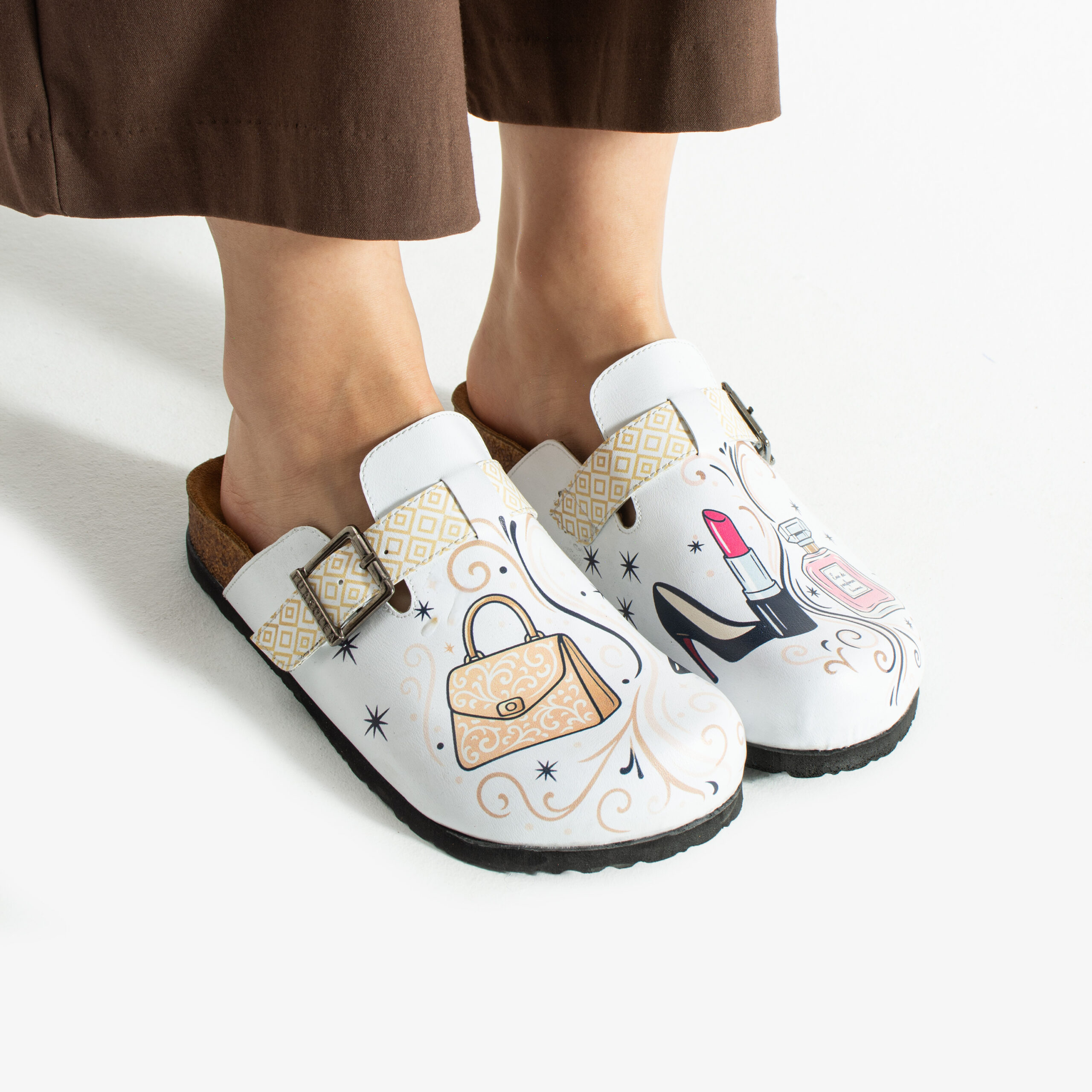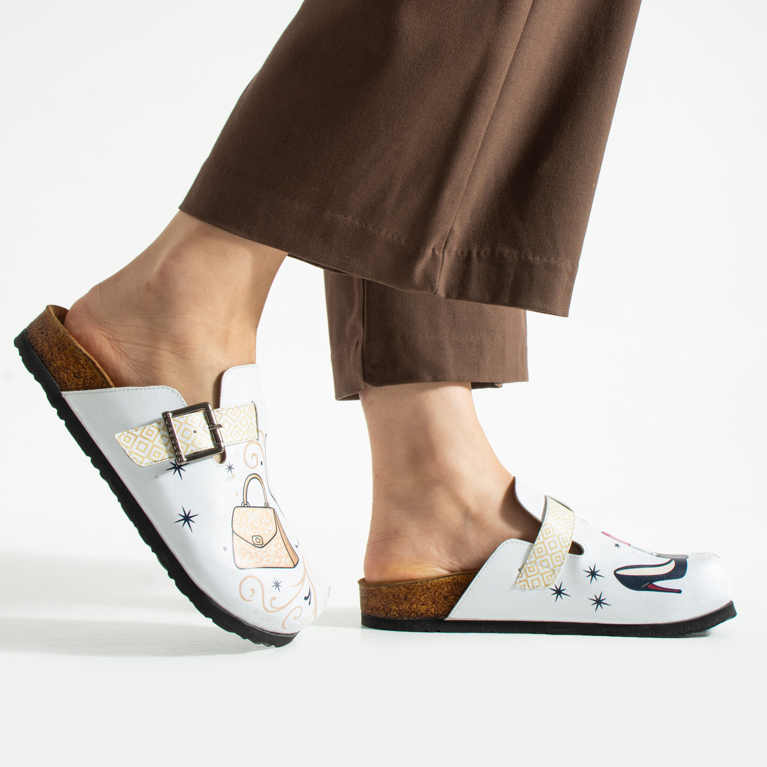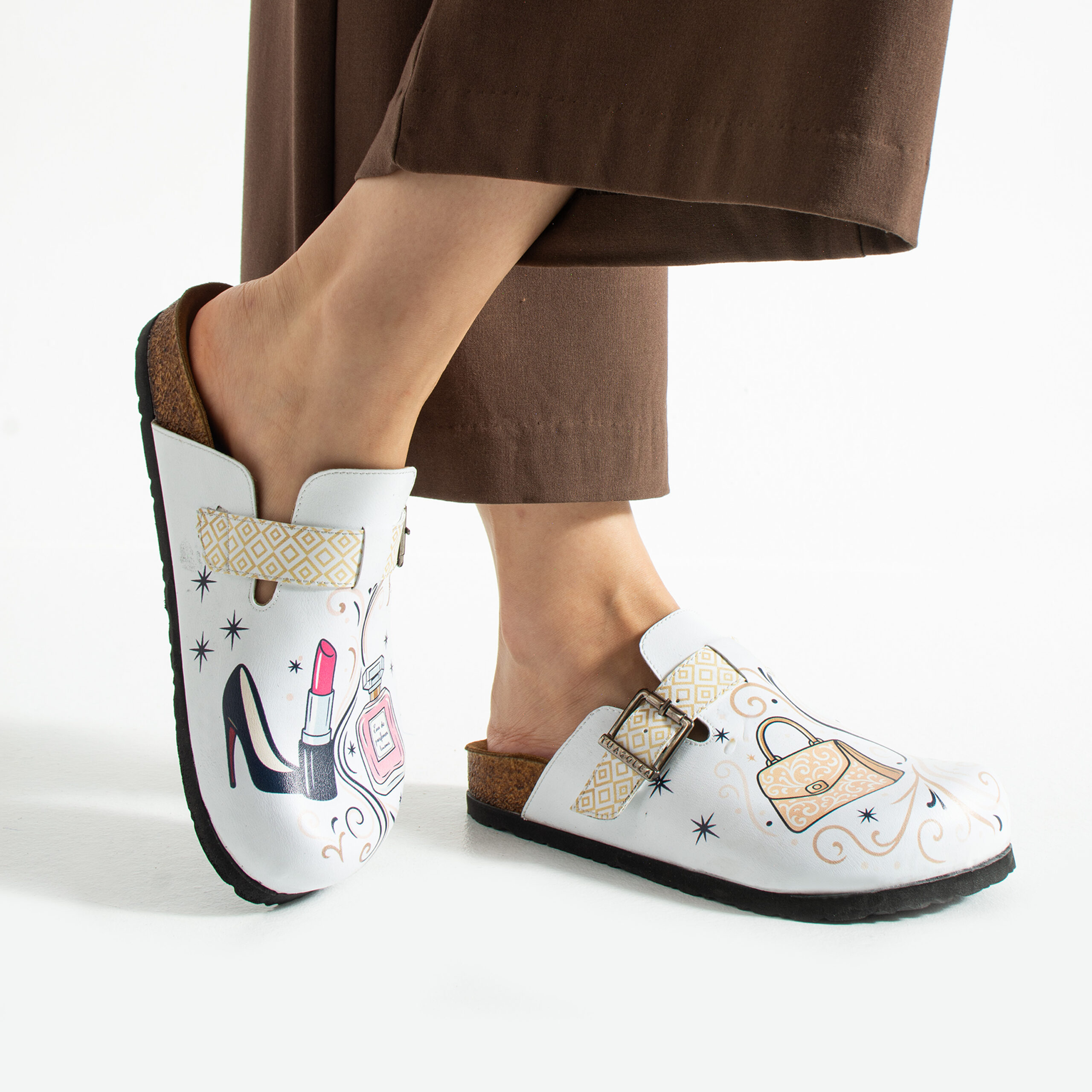 Изработени са от висококачествена еко кожа, устойчива на напукване и деформация, с дълготраен UV печат, който запазва цветовете си за дълго. Ортопедичната подметка осигурява стабилна опора и равномерно разпределение на натоварването при ходене, а стелката от микрофибър е приятна на допир, не запарва и не позволява приплъзване. Формата на сабото не притиска пръстите, металната катарама е устойчива на корозия и позволява лесно напасване към нормален и леко по-широк крак, а материалите не задържат прах, петна и неприятни миризми при ежедневно носене.