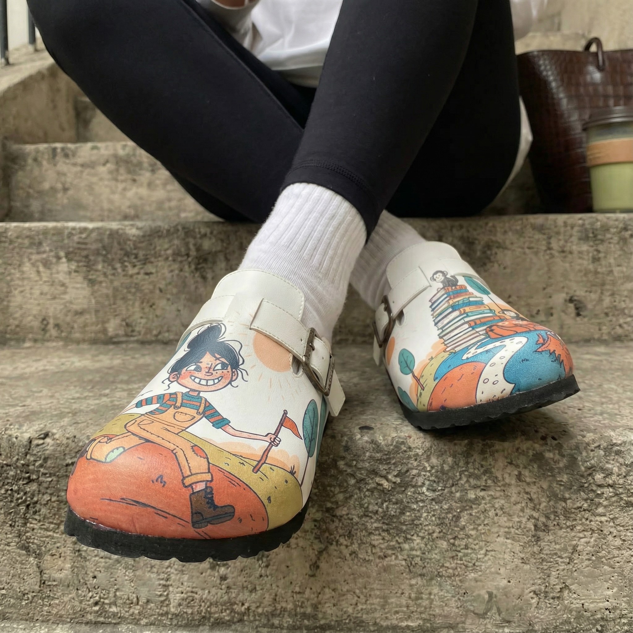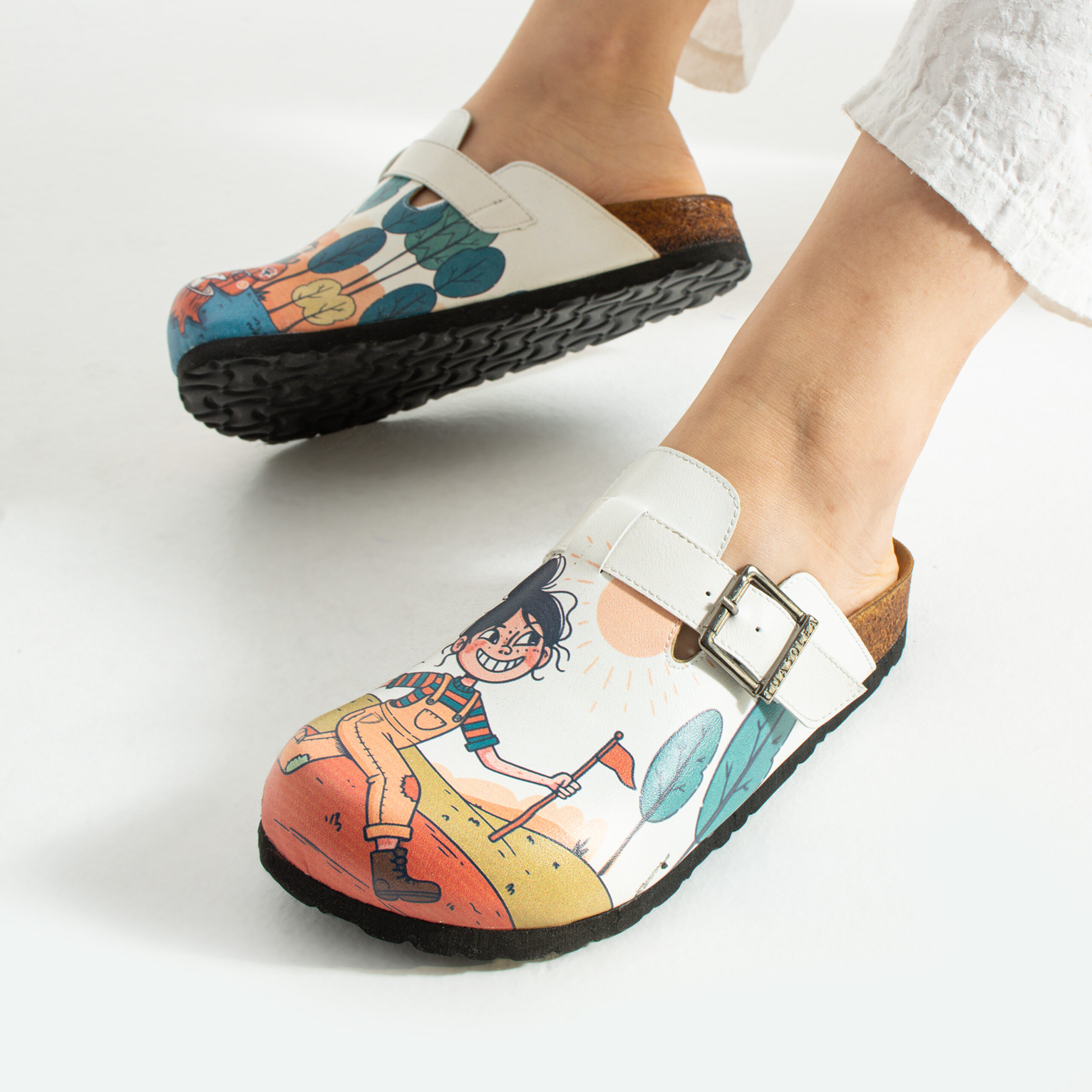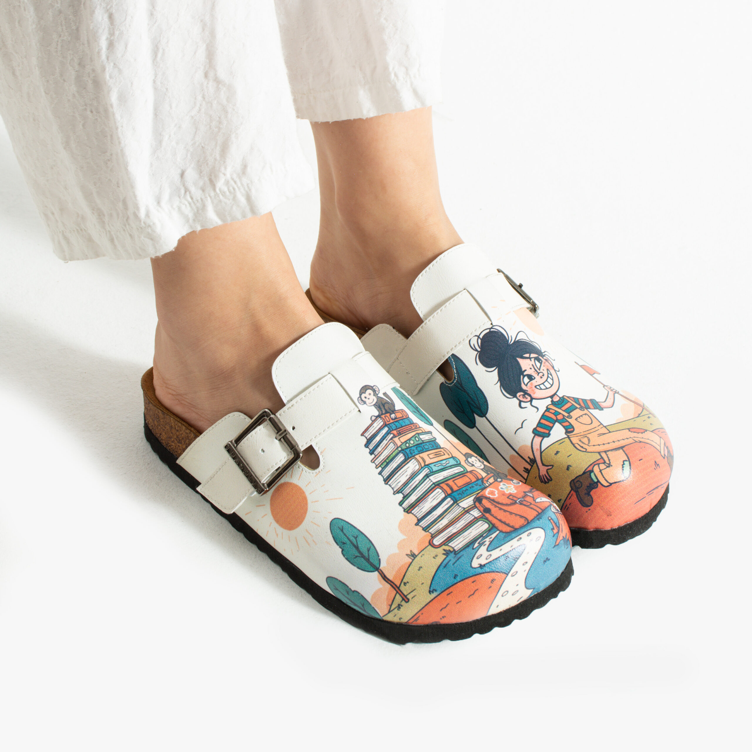 Изработени са от висококачествена еко кожа, устойчива на напукване и деформация, с дълготраен UV печат с илюстративен приключенски мотив, който запазва цветовете си за дълго. Ортопедичната подметка осигурява стабилна опора и равномерно разпределение на натоварването при продължително ходене, а стелката от микрофибър е приятна на допир, не запарва и не позволява приплъзване. Формата на сабото не притиска пръстите, металната катарама е устойчива на корозия и позволява лесно напасване към нормален и леко по-широк крак, а материалите не задържат прах, петна и неприятни миризми при ежедневно носене.