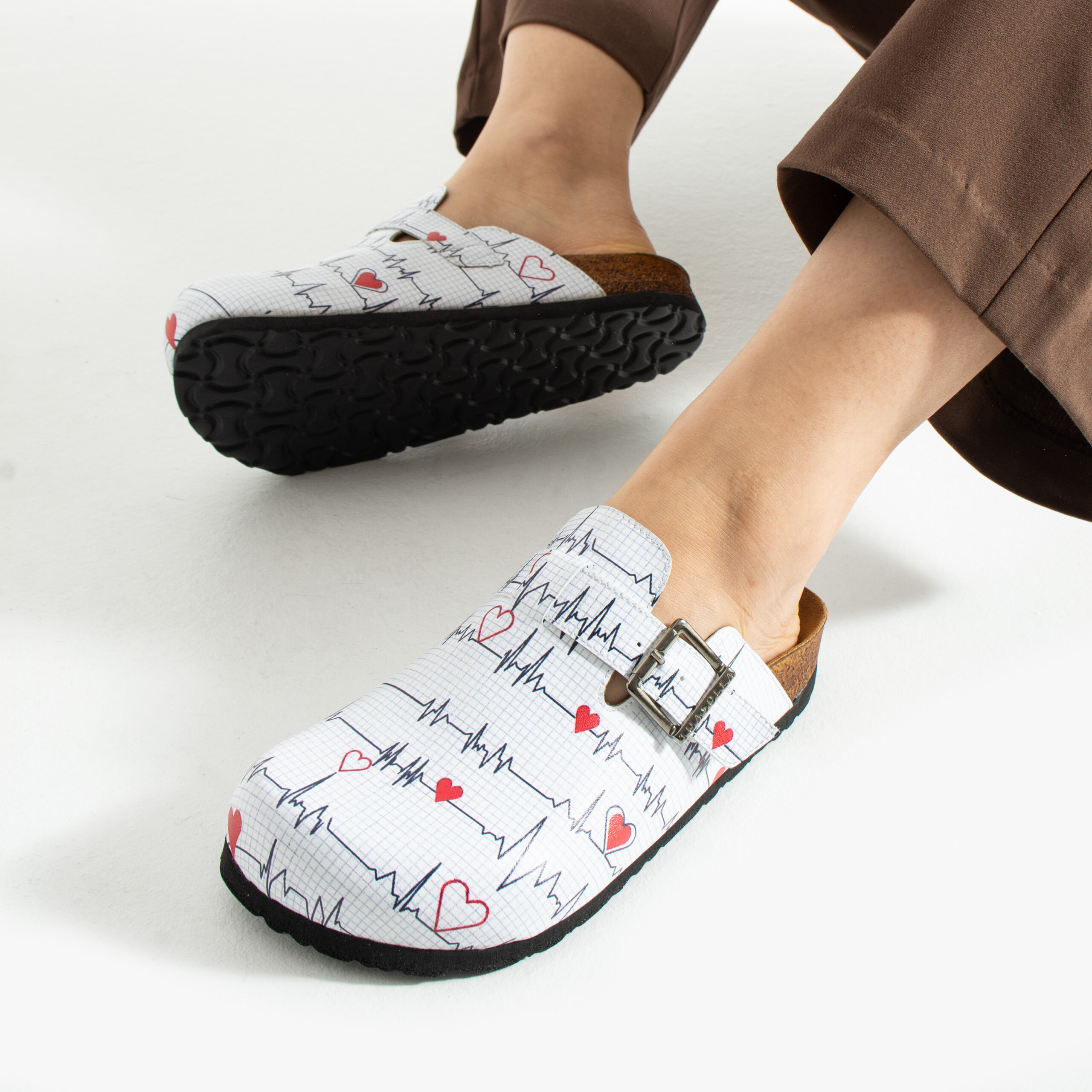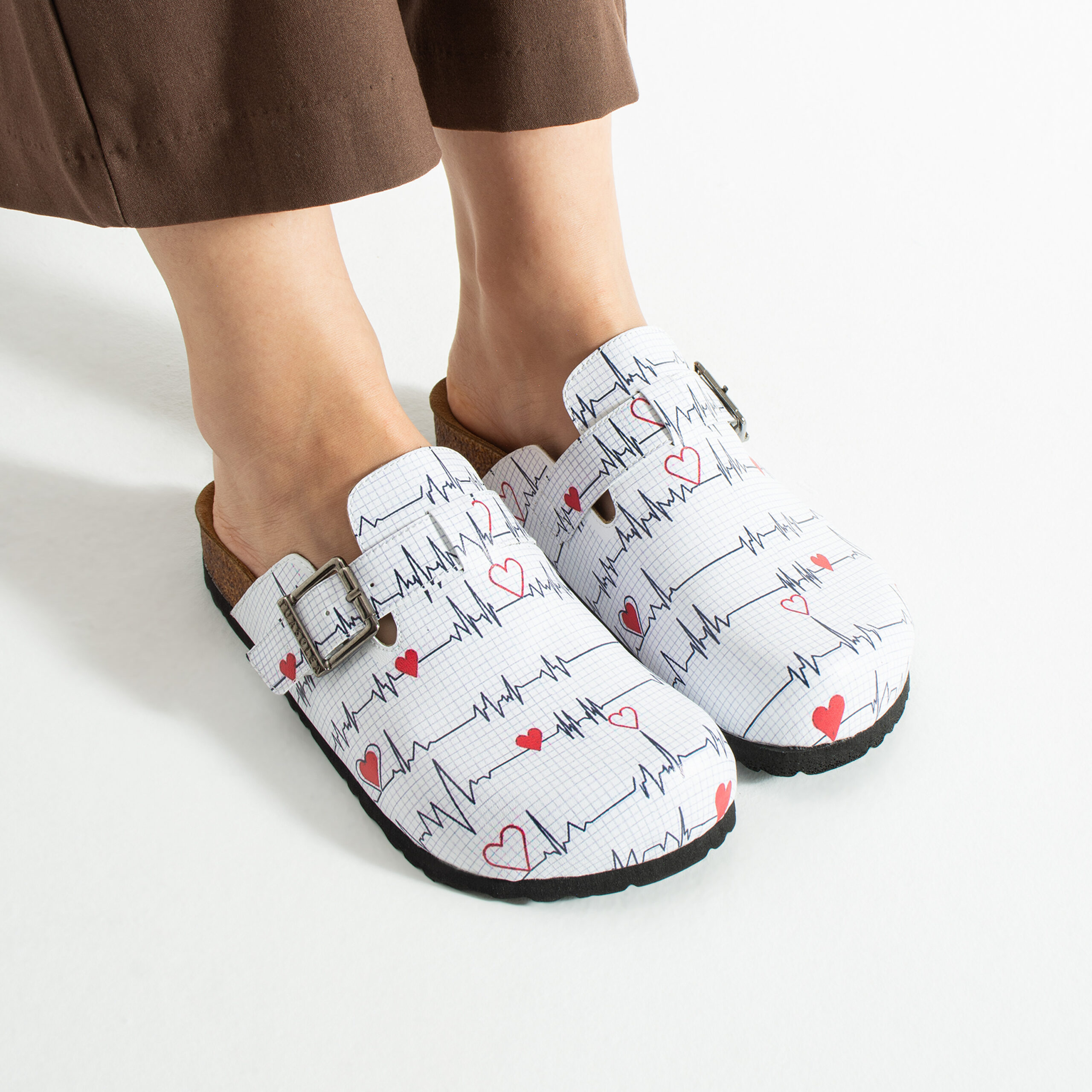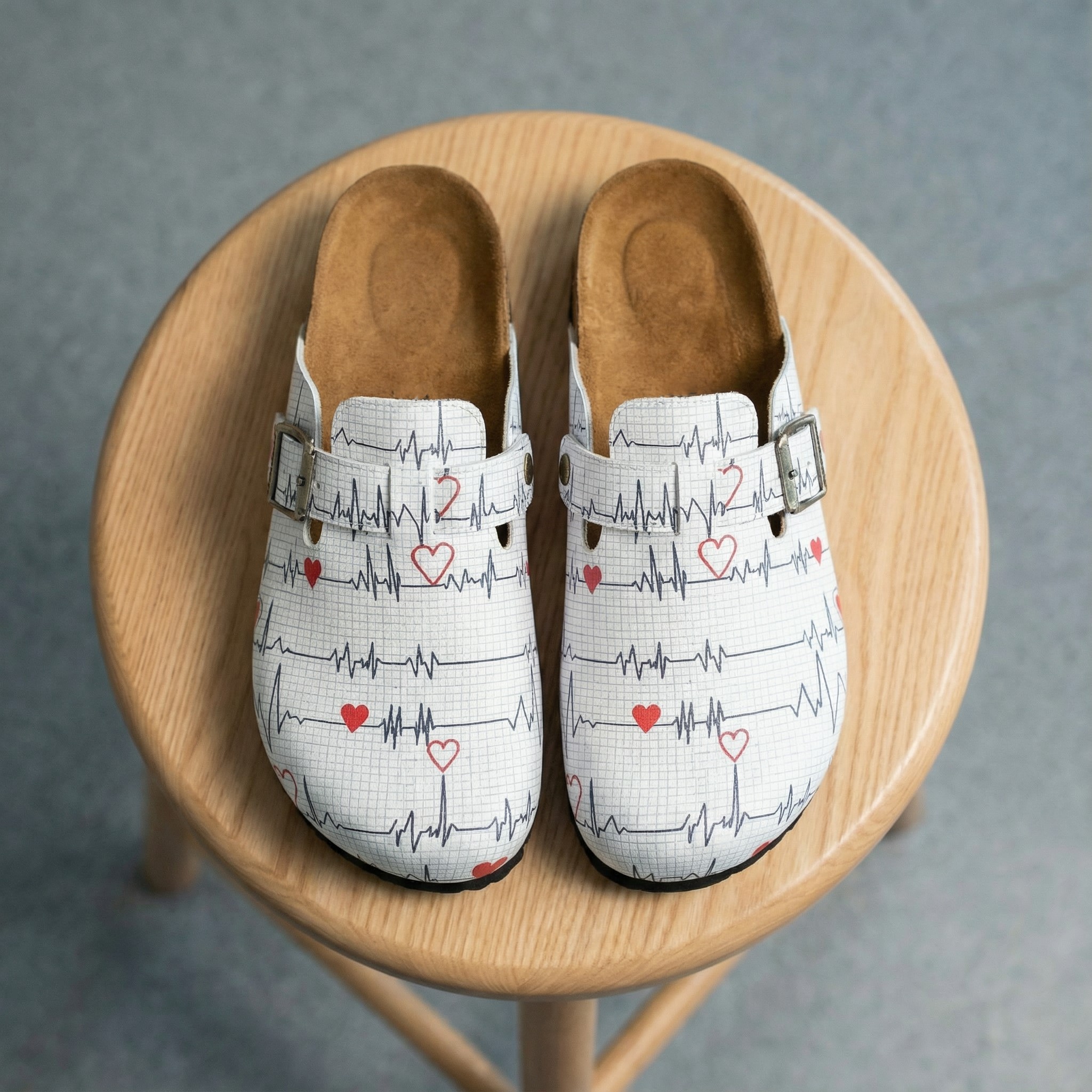 Чехлите са изработени от висококачествена еко кожа, устойчива на напукване и деформация, с дълготраен UV печат с ЕКГ мотиви, който запазва цветовете си дори при интензивна ежедневна употреба. Ортопедичната подметка осигурява стабилна опора и равномерно разпределение на натоварването, като намалява умората в стъпалата, глезените и кръста при продължително стоене и движение.