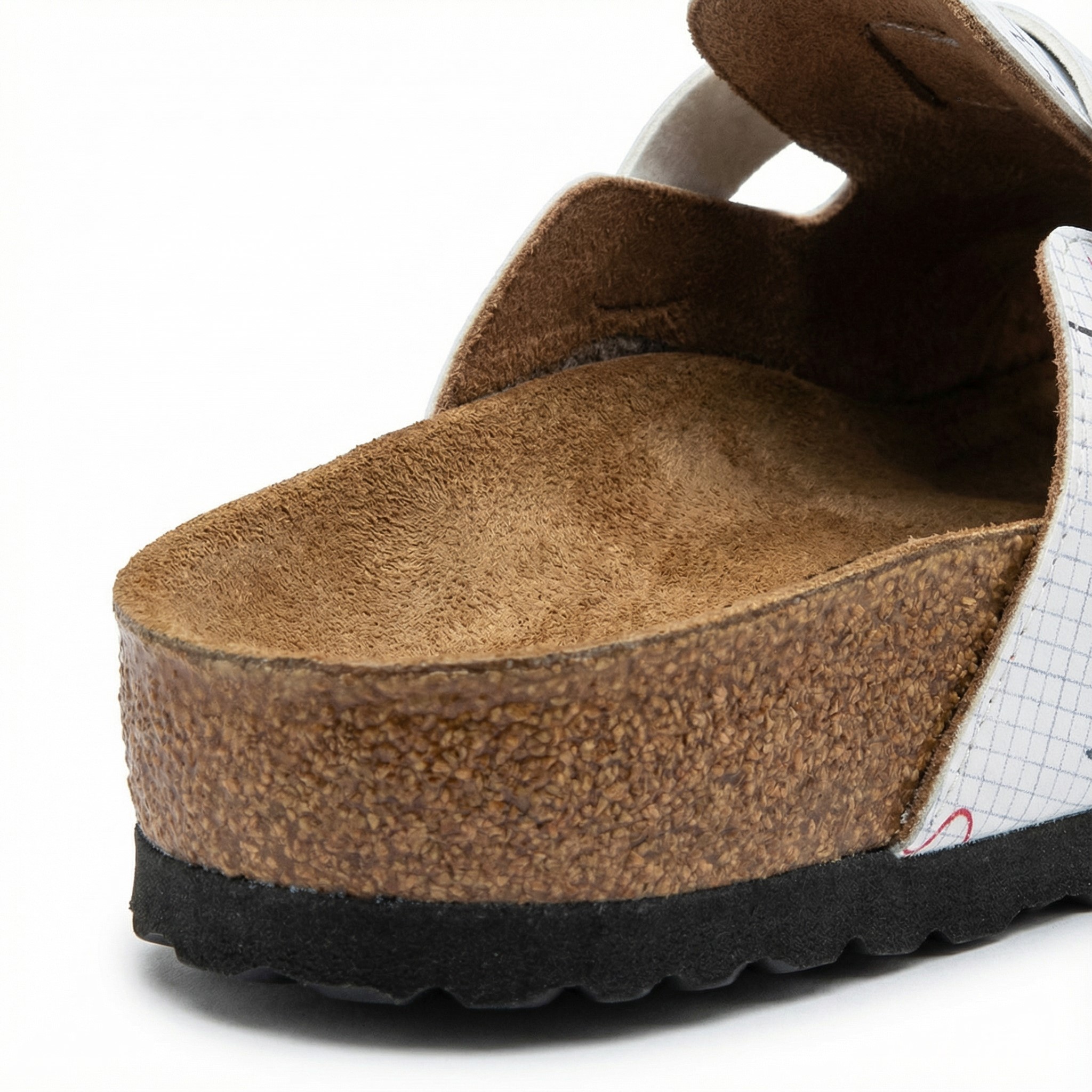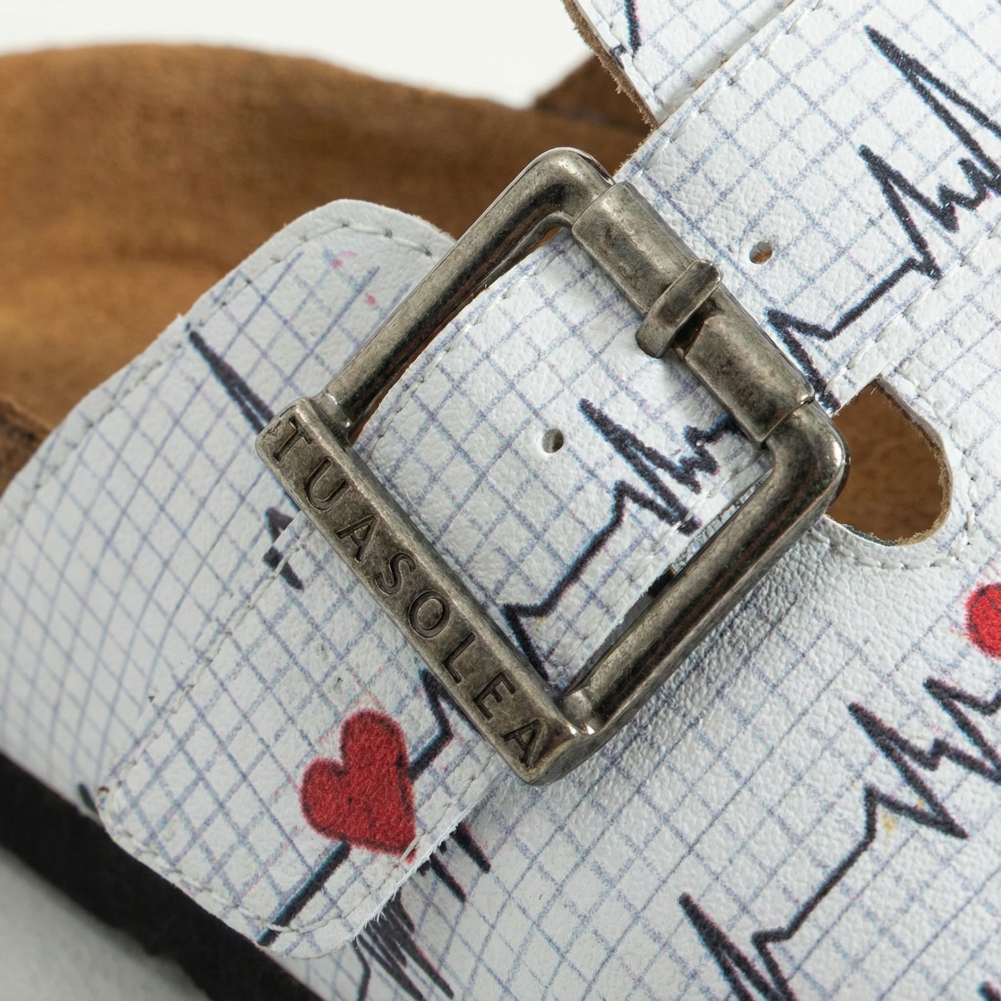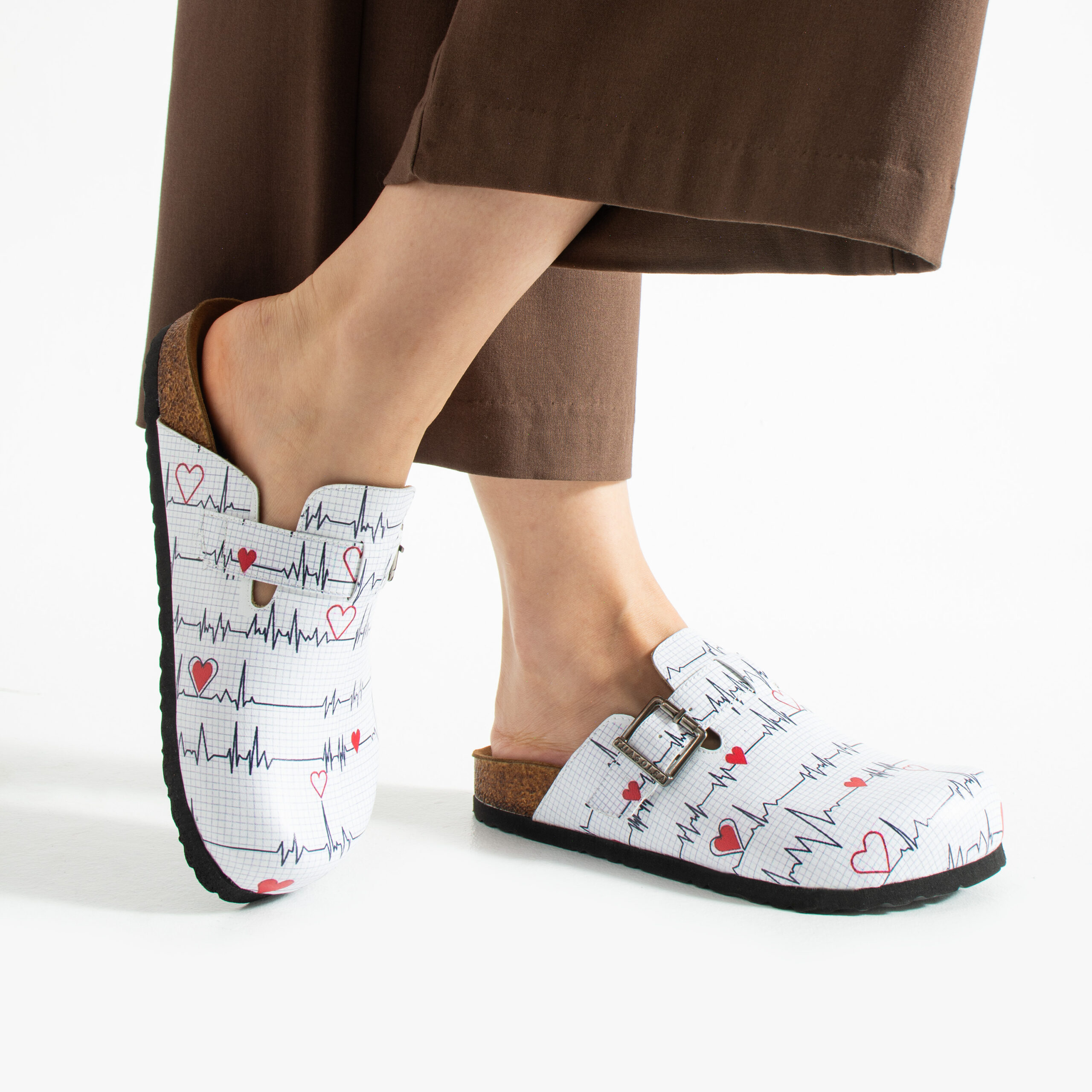Чехлите са изработени от висококачествена еко кожа, устойчива на напукване и деформация, с дълготраен UV печат с ЕКГ мотиви, който запазва цветовете си дори при интензивна ежедневна употреба. Ортопедичната подметка осигурява стабилна опора и равномерно разпределение на натоварването, като намалява умората в стъпалата, глезените и кръста при продължително стоене и движение.
