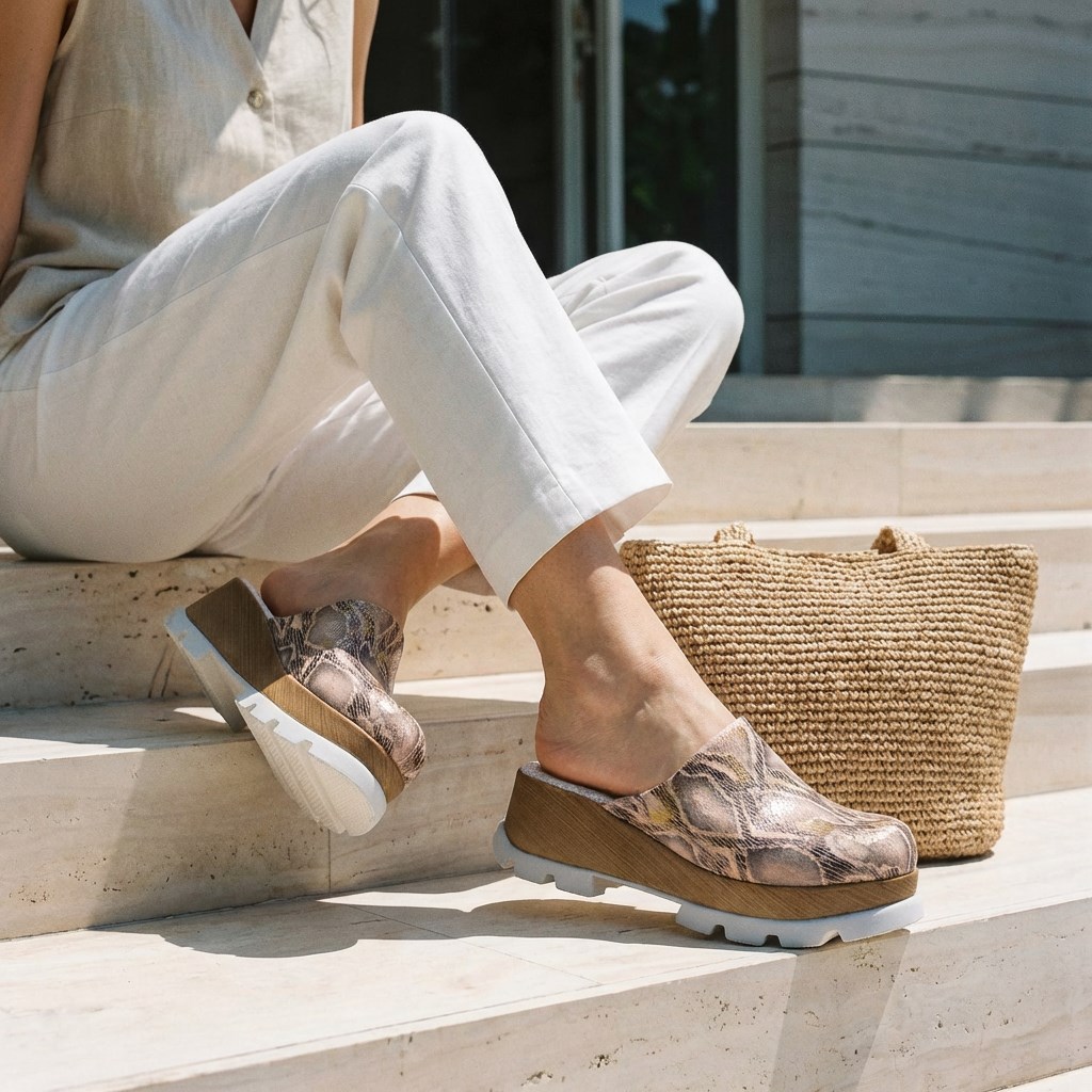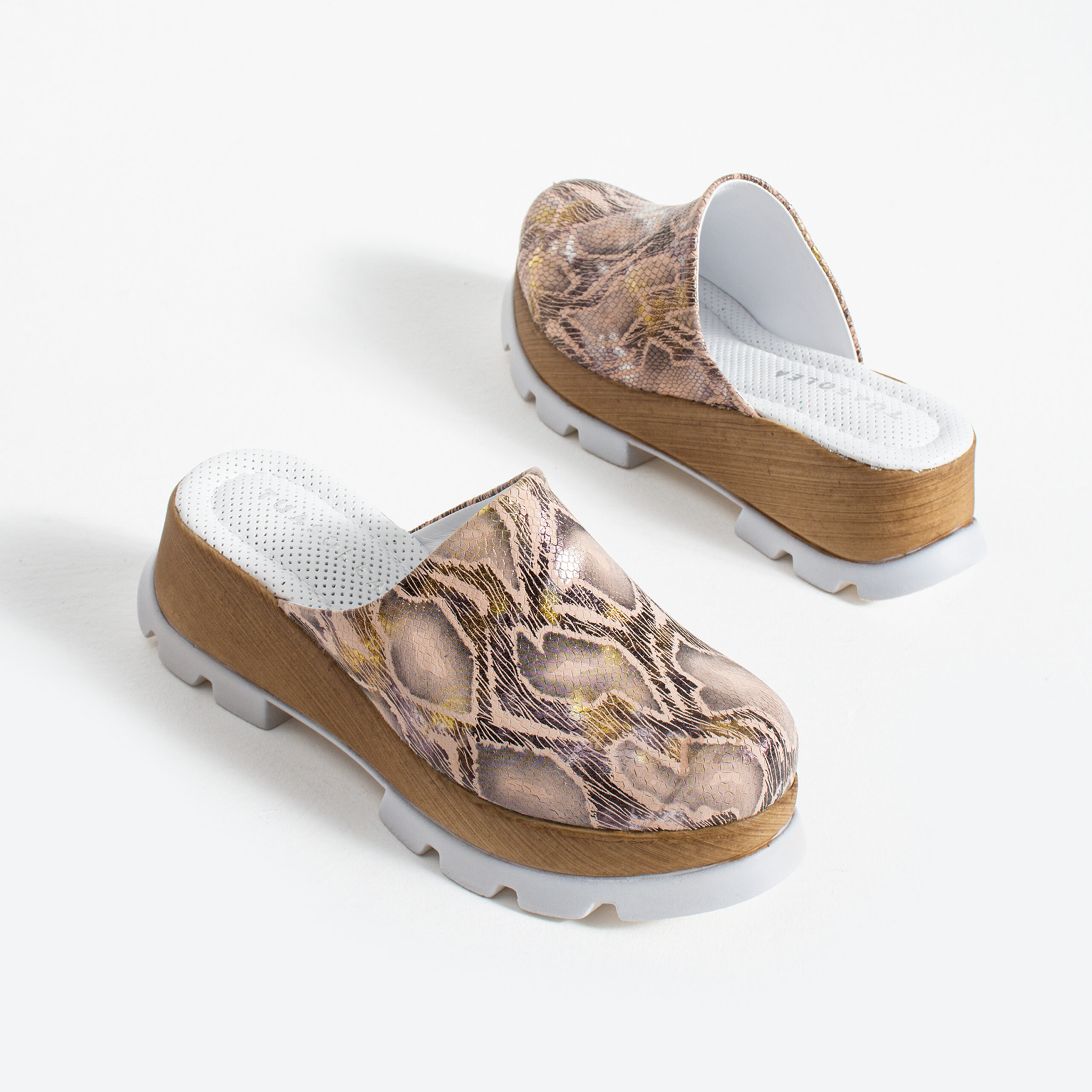 Розово-златистото дамско сабо на платформа от серия Imara на TUASOLEA е свеж прочит на класическото дървено сабо – по-леко на крак, по-удобно за носене и с женствено излъчване, което се усеща веднага.