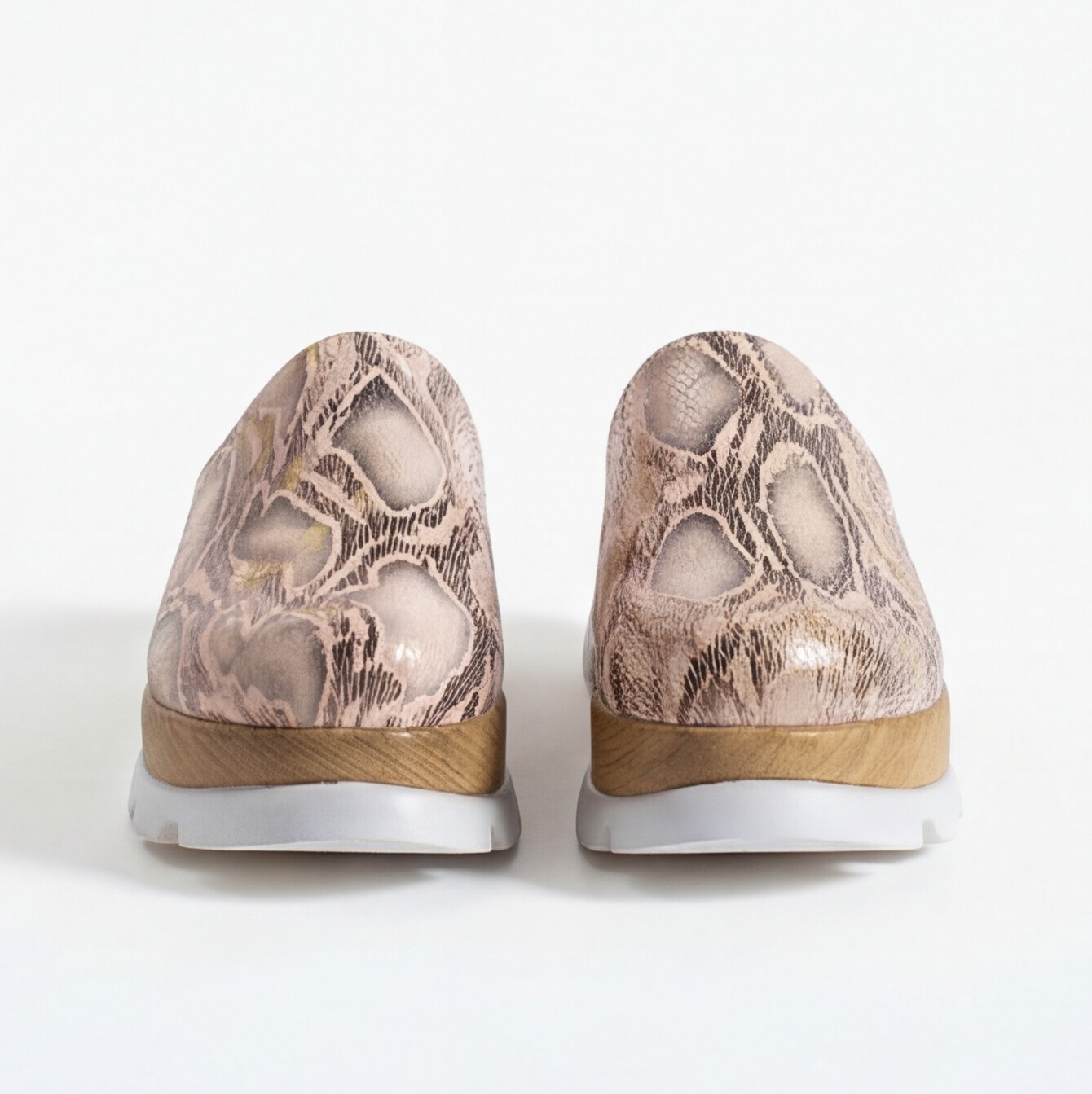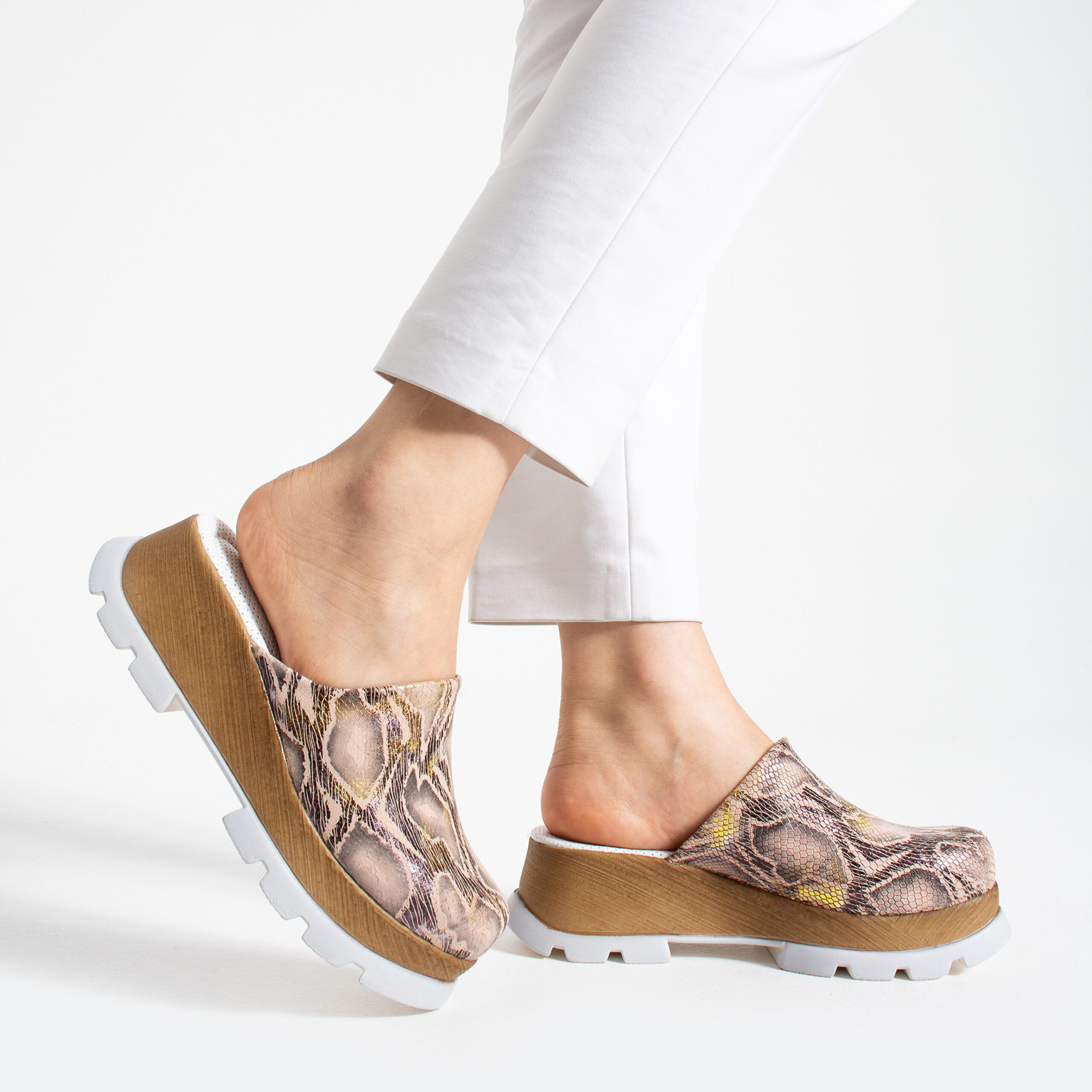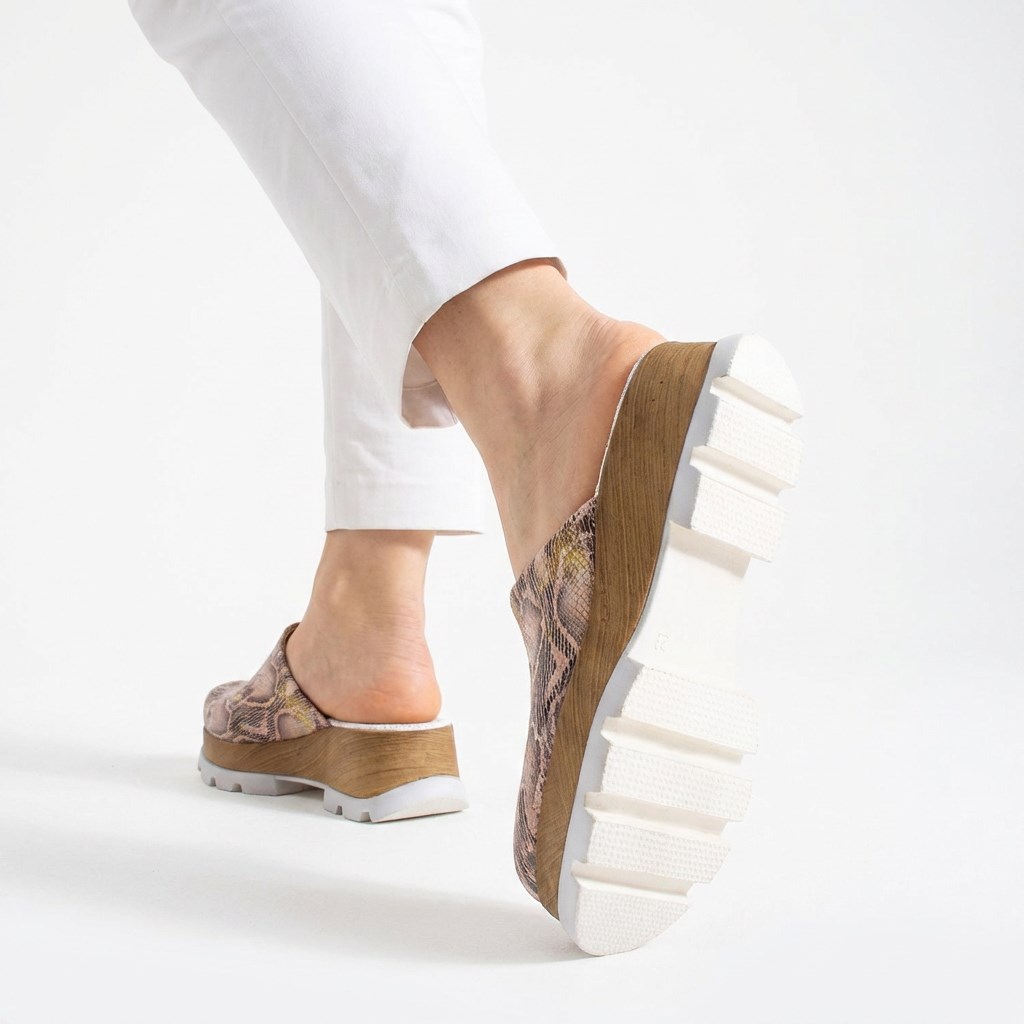 Затвореният връх придава мек силует, който стои добре както с ежедневни дрехи, така и с по-ефирни и елегантни комбинации. Горната част е от естествена кожа със змийски принт в розови и златисти нюанси, които добавят фин блясък и дълбочина, без моделът да изглежда натрапчиво. Кожата е мека и следва формата на ходилото, без да стяга.