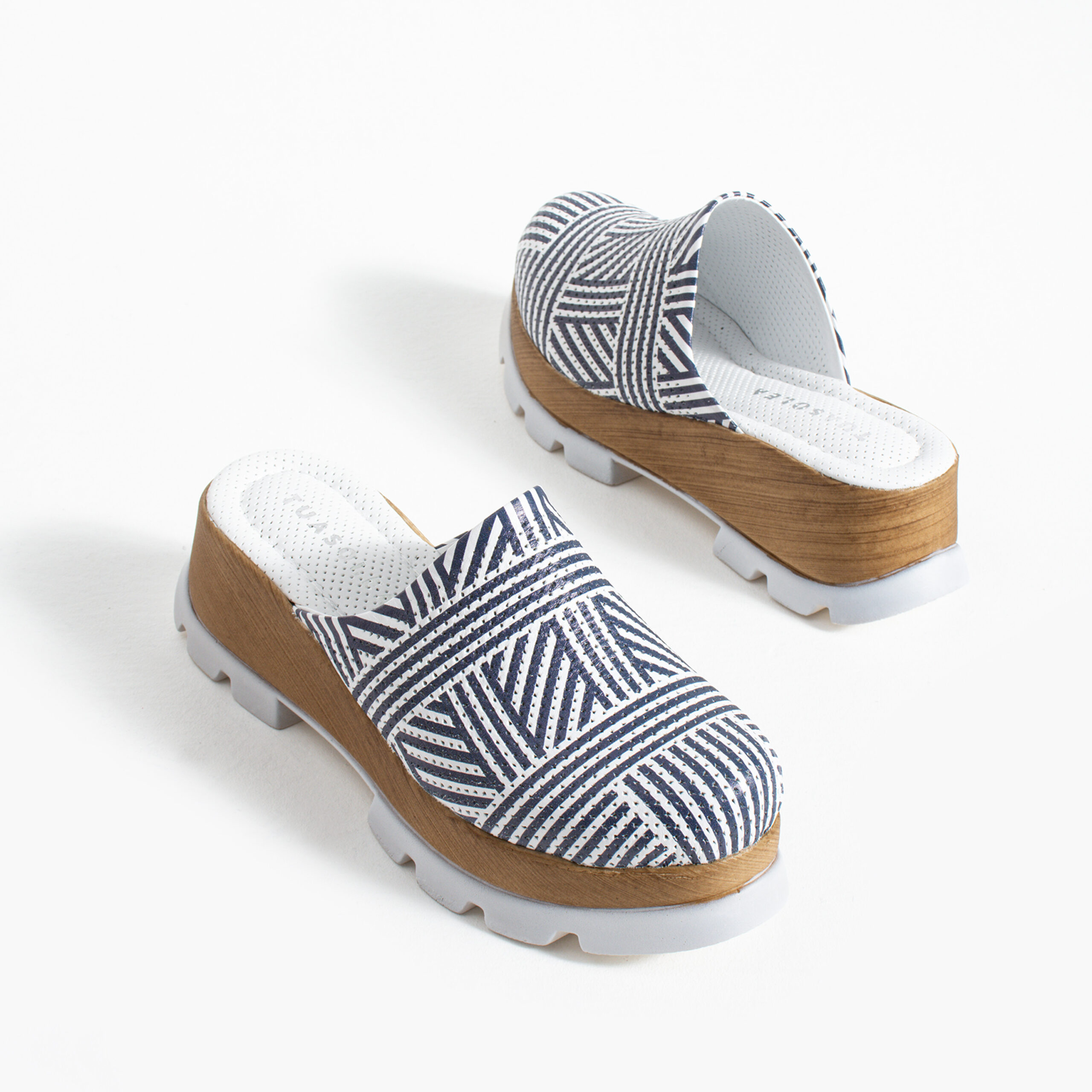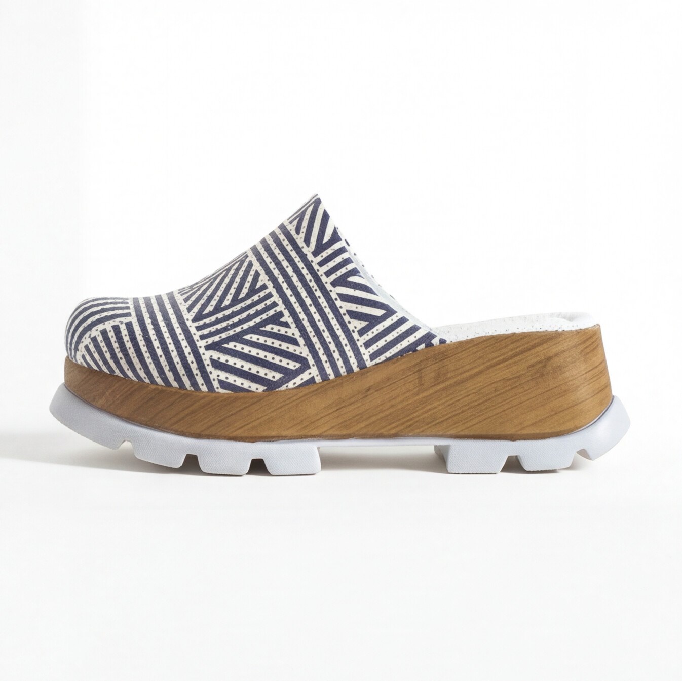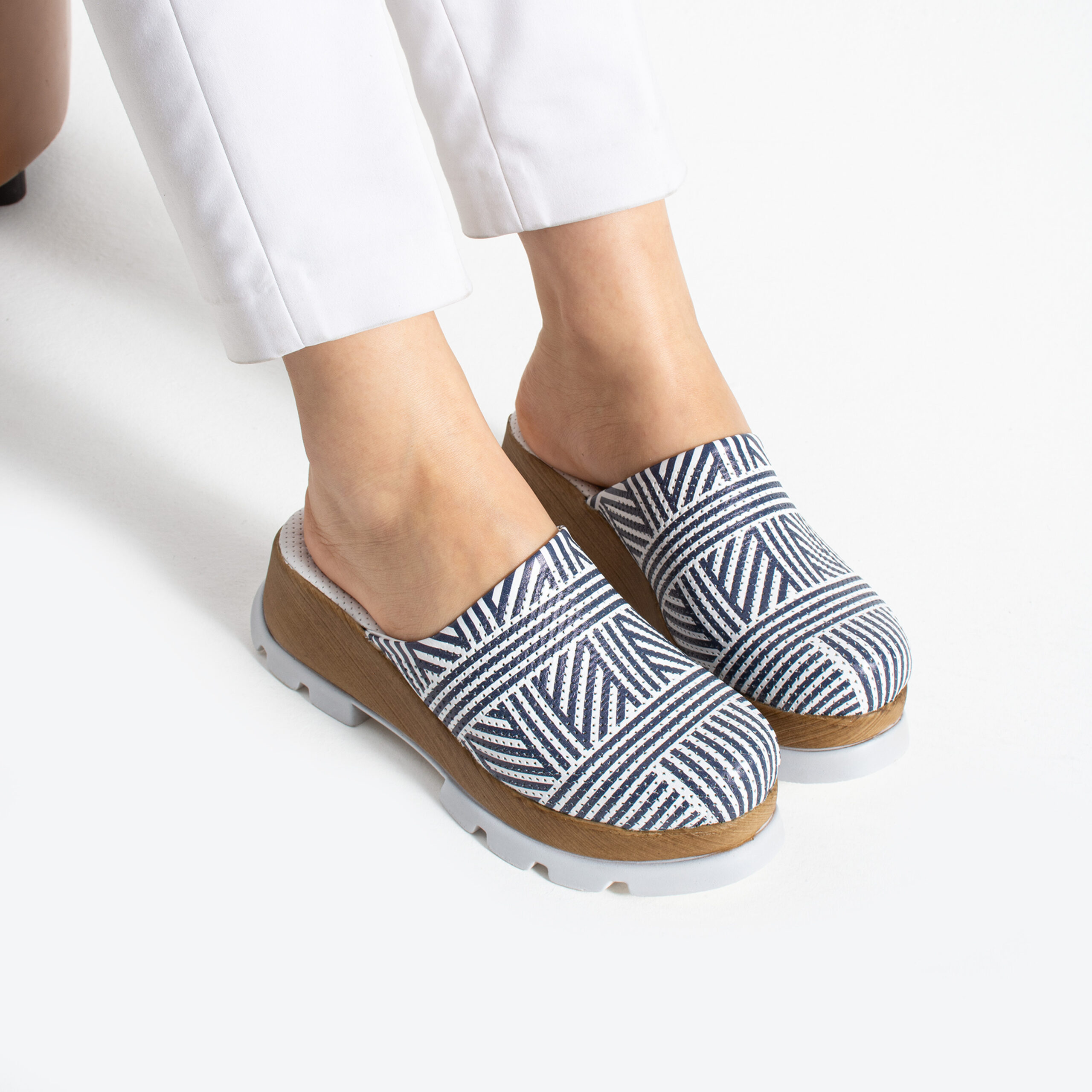 Синьо-бялото дамско сабо на платформа от серия Imara на TUASOLEA е модерна версия на класическото дървено сабо – по-леко за носене и по-удобно за всеки ден.