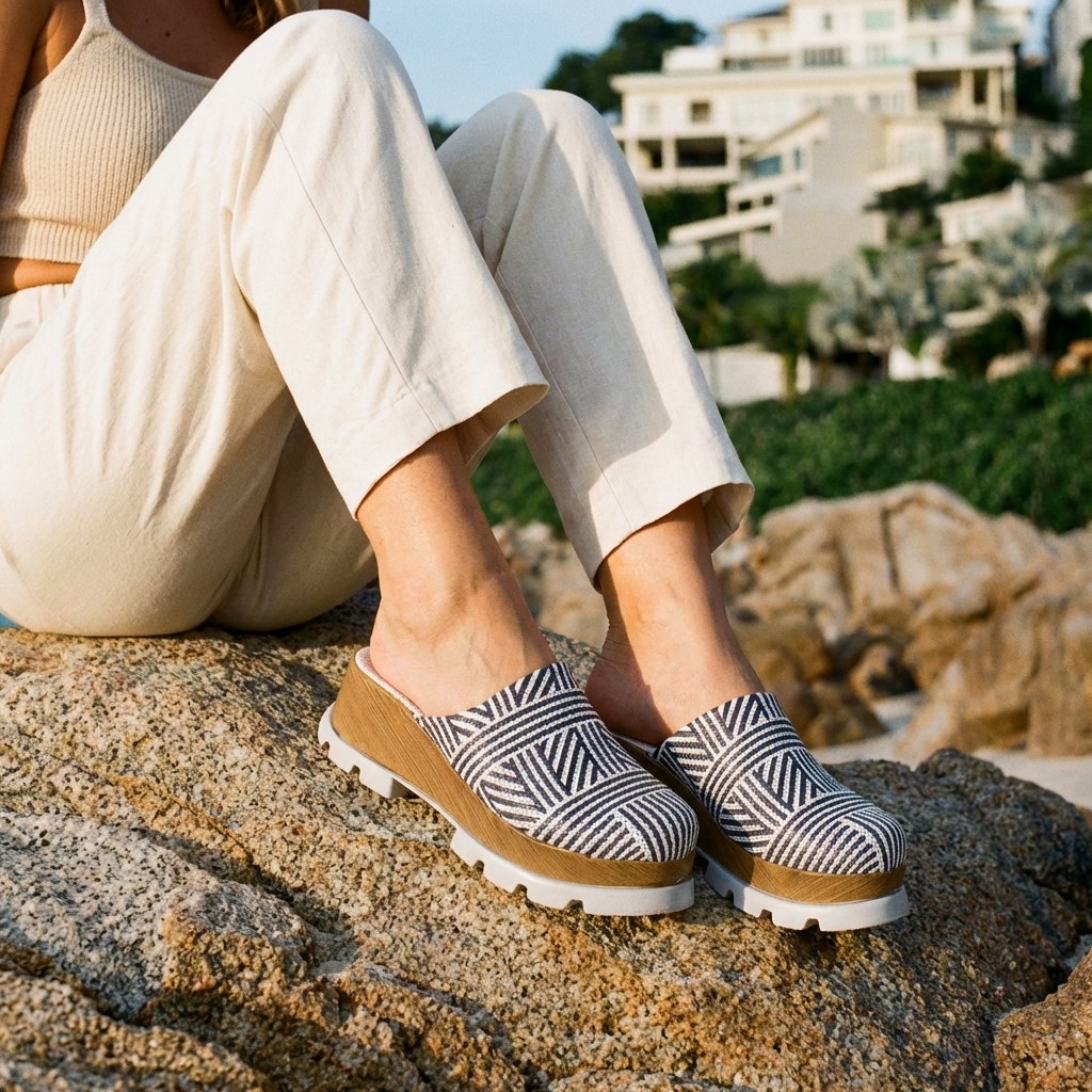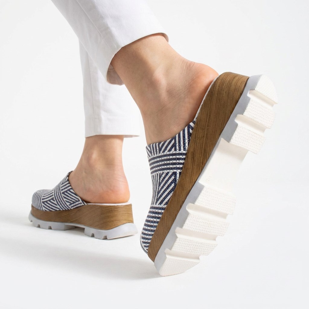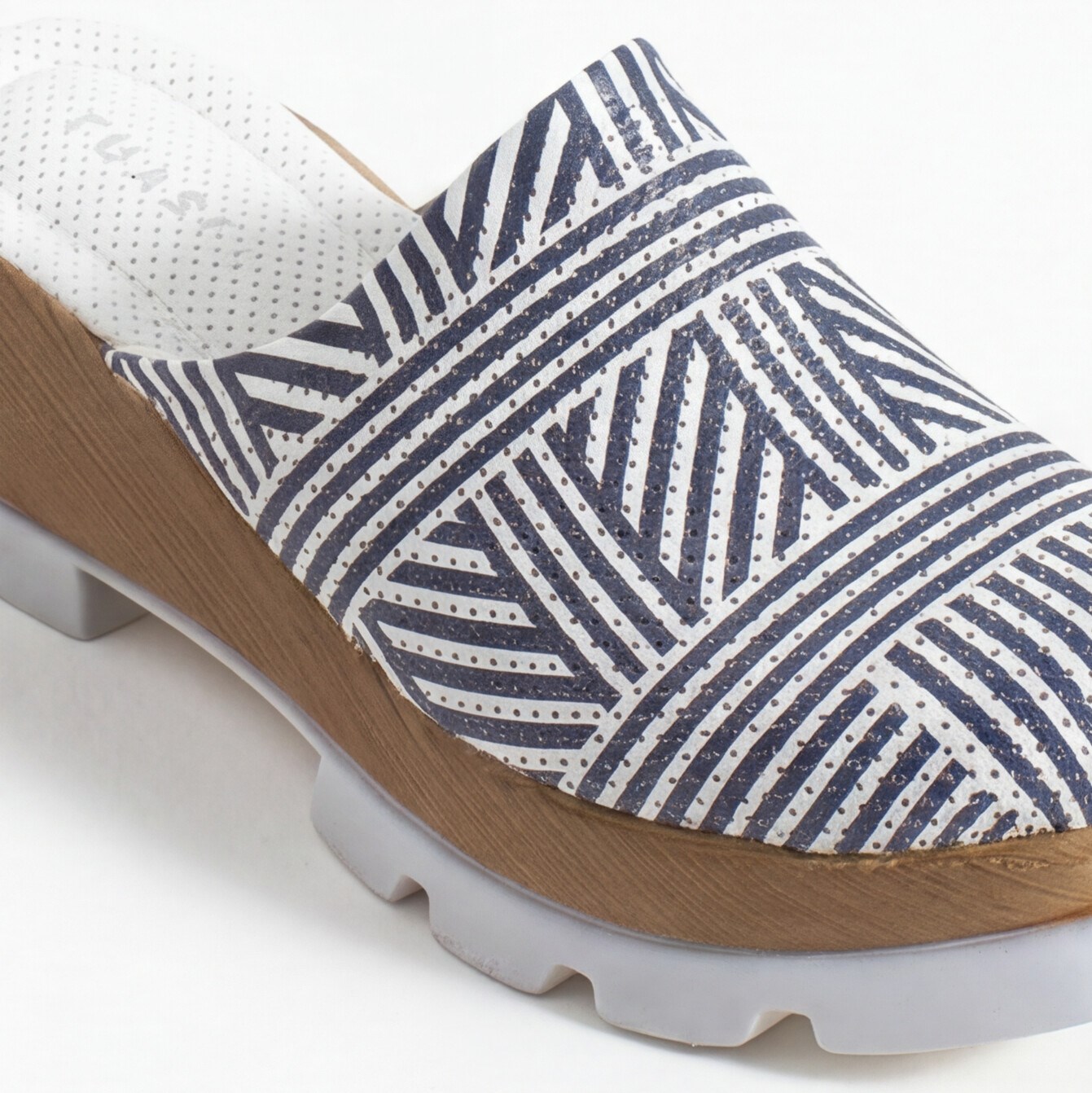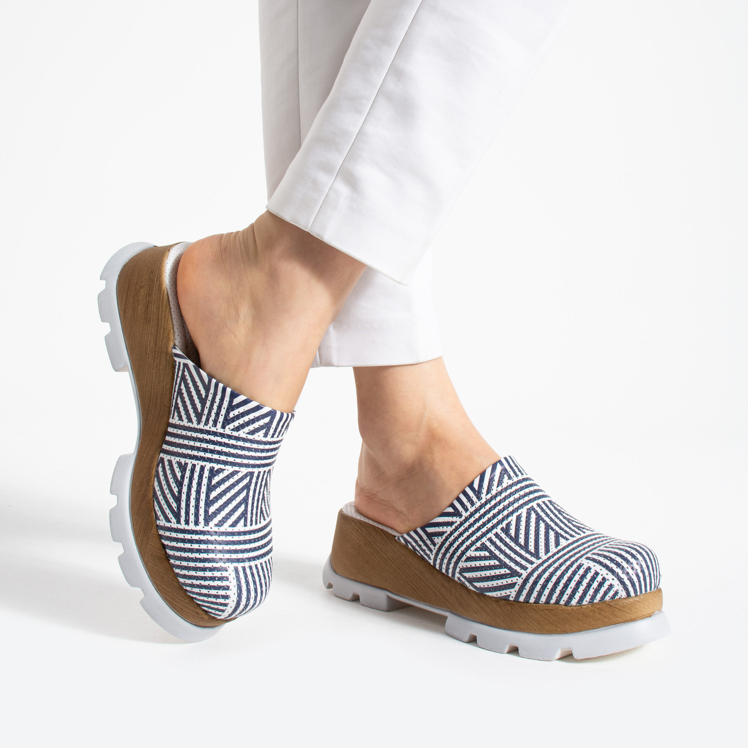 Синьо-бялото дамско сабо на платформа от серия Imara на TUASOLEA е модерна версия на класическото дървено сабо – по-леко за носене и по-удобно за всеки ден.