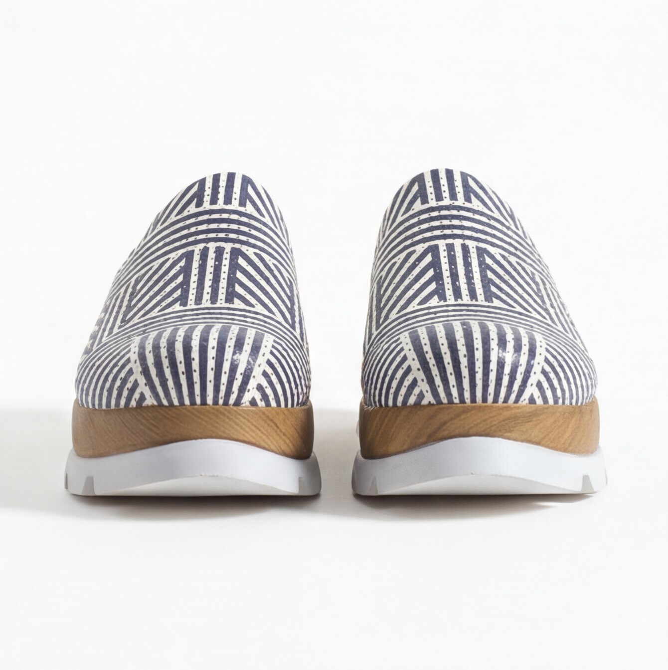 Затвореният връх стои елегантно на крака и прави модела лесен за комбиниране – както с дънки и по-небрежни визии, така и с по-ефирни тоалети. Горната част е от естествена кожа със синьо-бял геометричен десен, който внася свеж акцент и стои модерно. Кожата е мека и се наглася по ходилото, без да стяга.