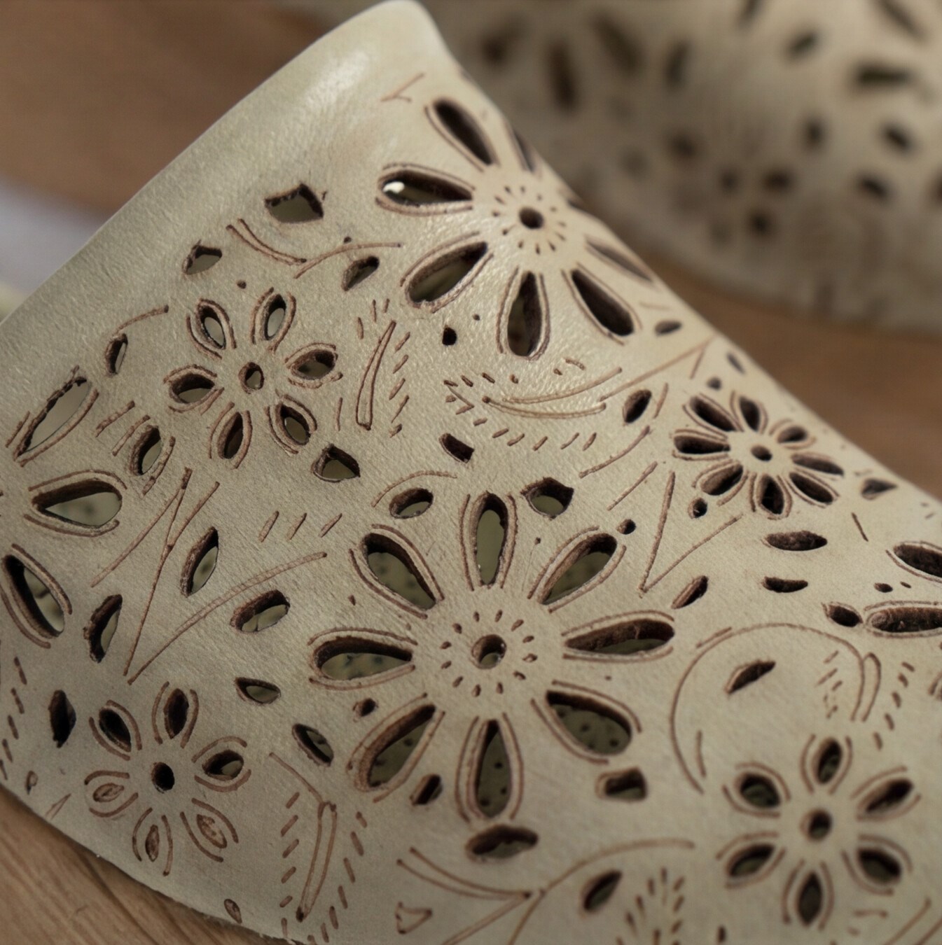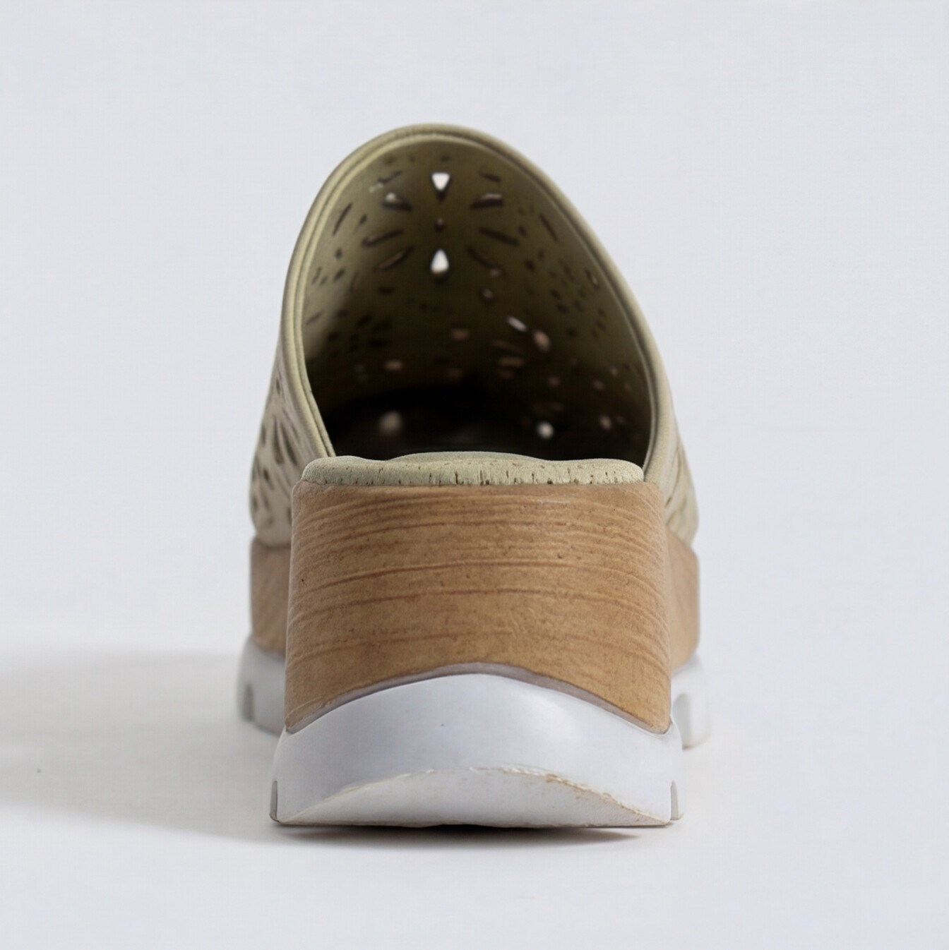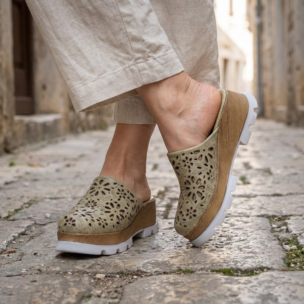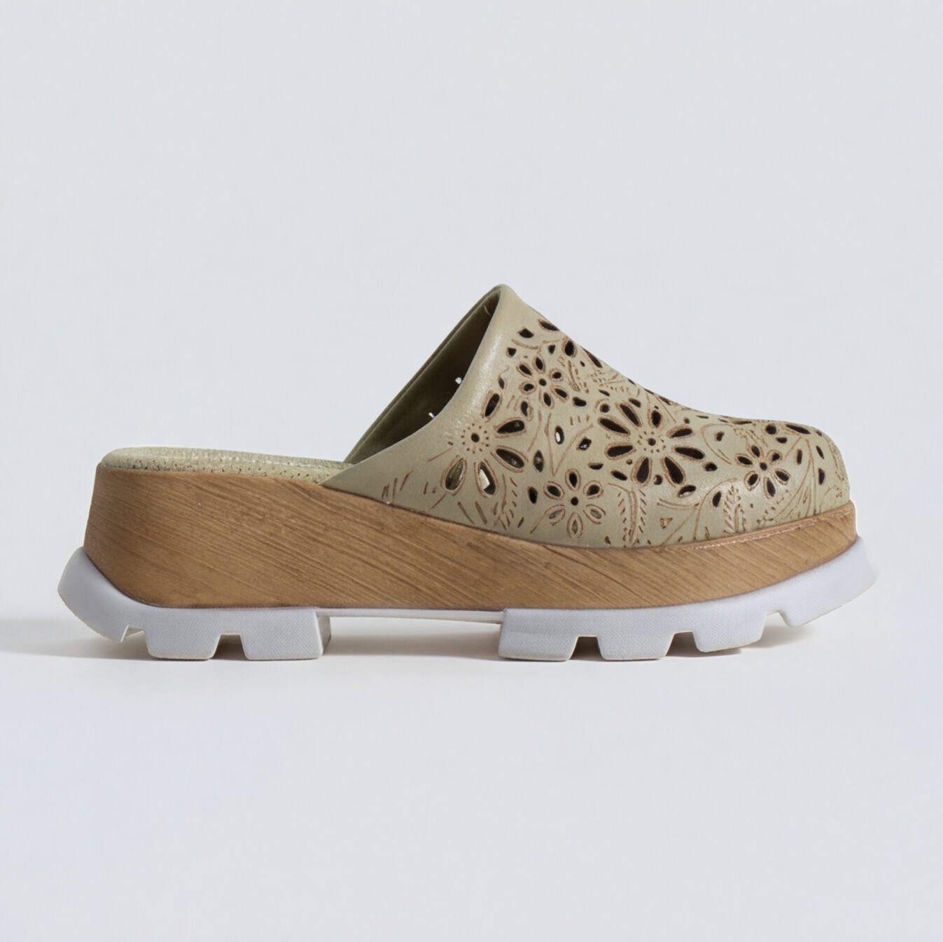 Затвореният връх придава елегантност и стои добре както с по-небрежни, така и с по-стилни визии. Горната част на това дамско сабо от естествена кожа е с едра флорална перфорация, която добавя характер и помага кракът да остава по-свеж в топлите дни. Кожата е мека и прилепва приятно по ходилото, без да стяга.