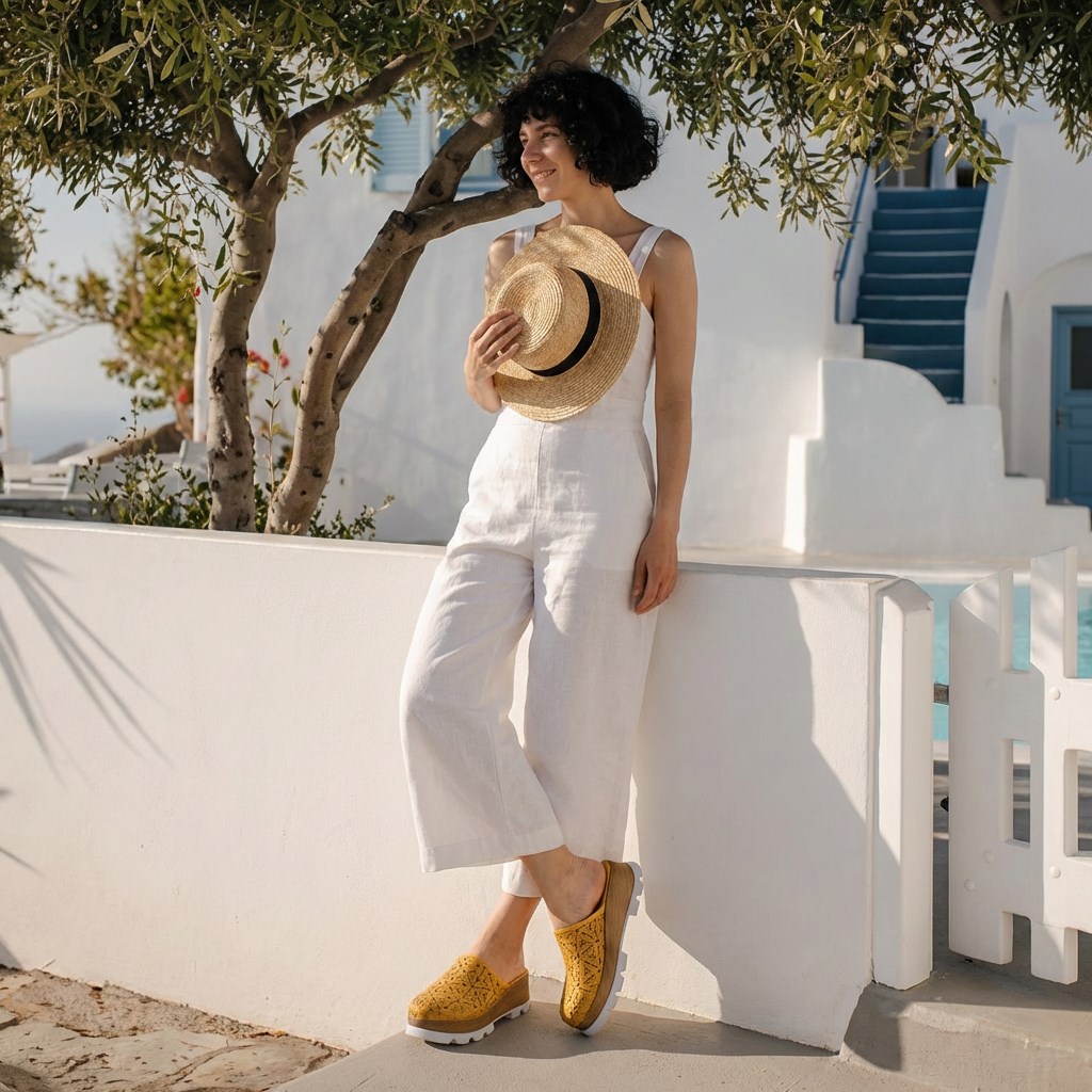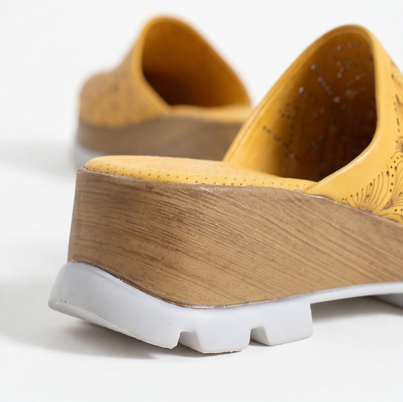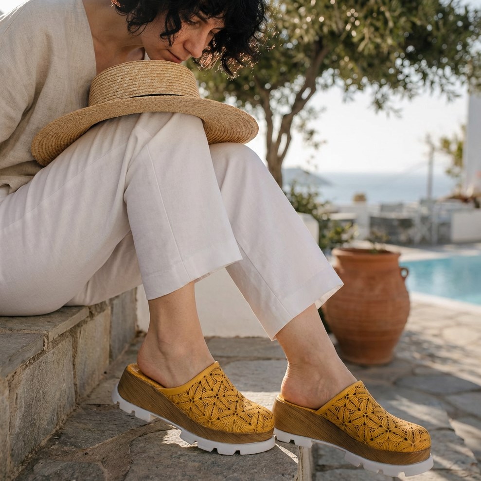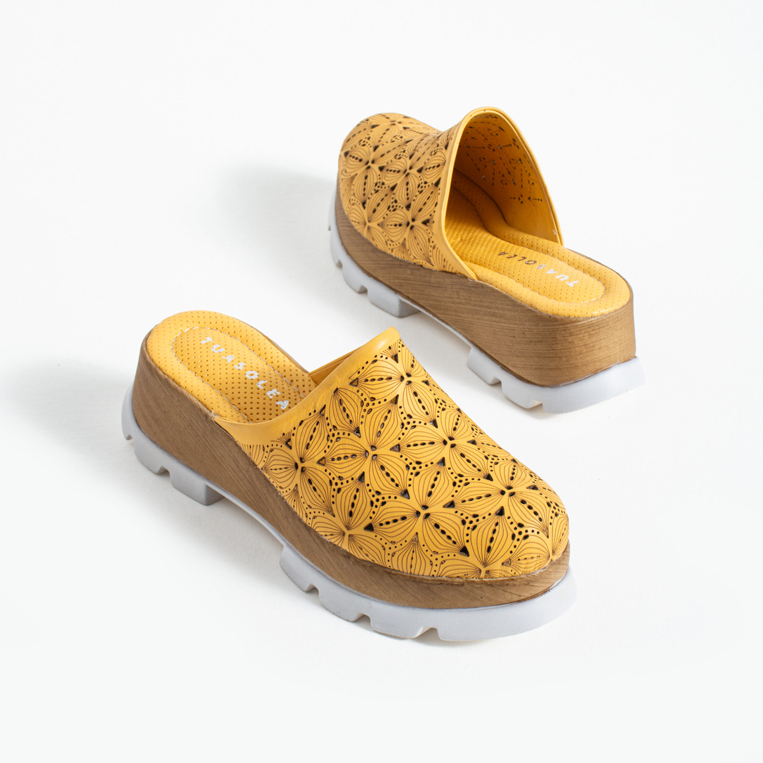 Жълто дамско сабо на платформа от серия Imara на TUASOLEA е свеж прочит на класическото дървено сабо – по-леко, по-удобно и направено за всеки ден.