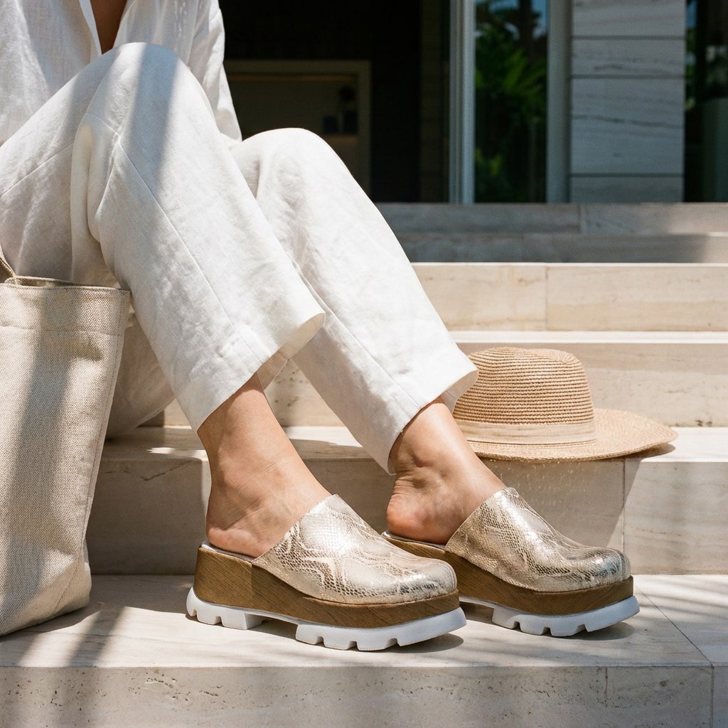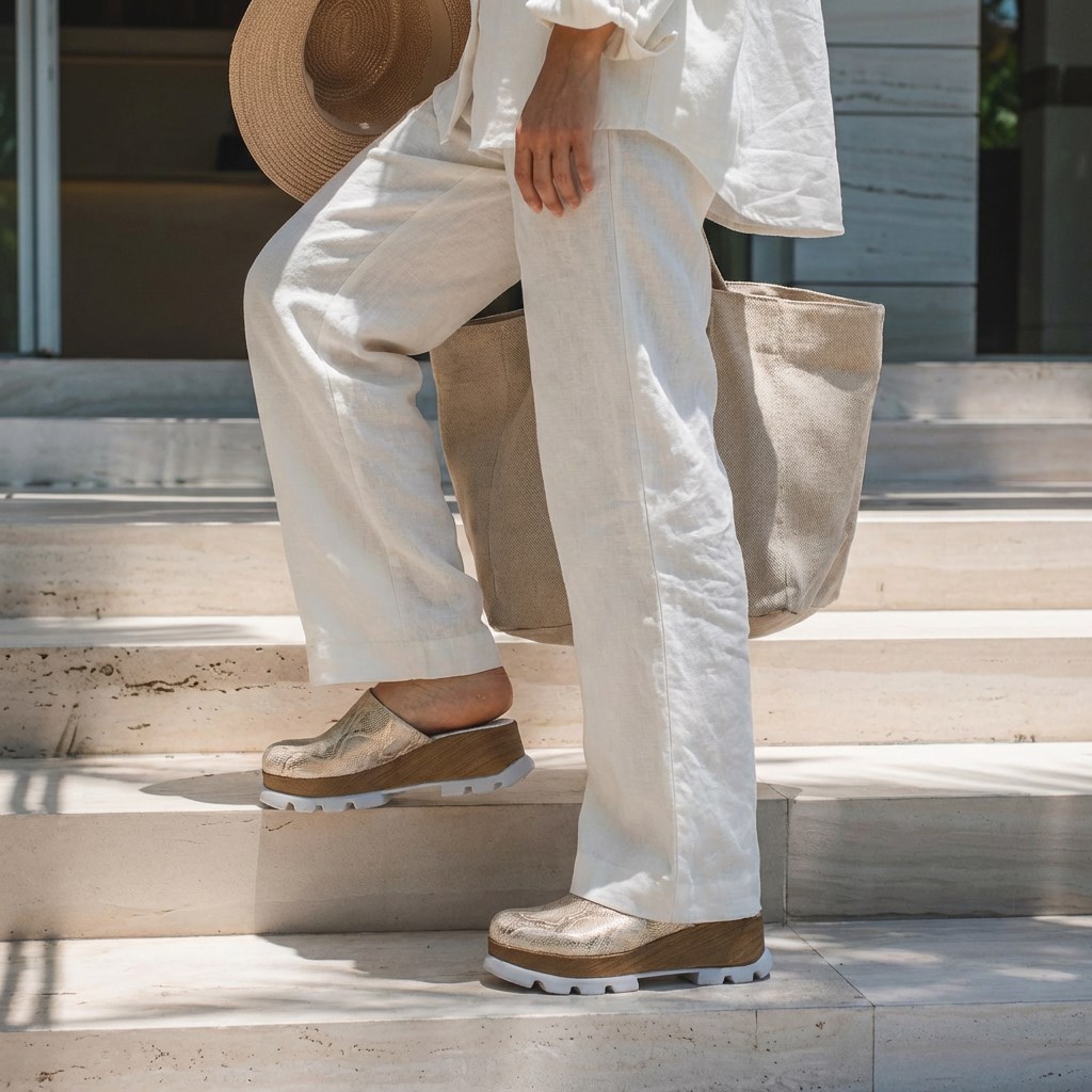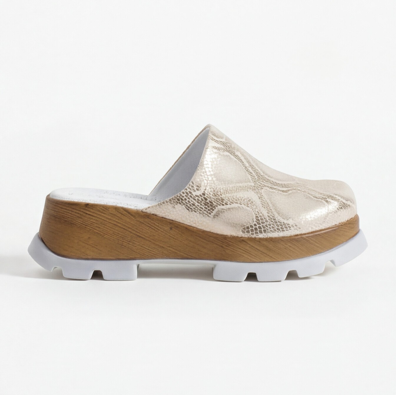 Златистото дамско сабо на платформа от серия Imara на TUASOLEA е модерна версия на класическото дървено сабо – по-леко, по-удобно и направено за ежедневието. Това дамско сабо от естествена кожа стои елегантно и се носи с лекота, когато искаш визията да бъде стилна, но без излишно усилие.