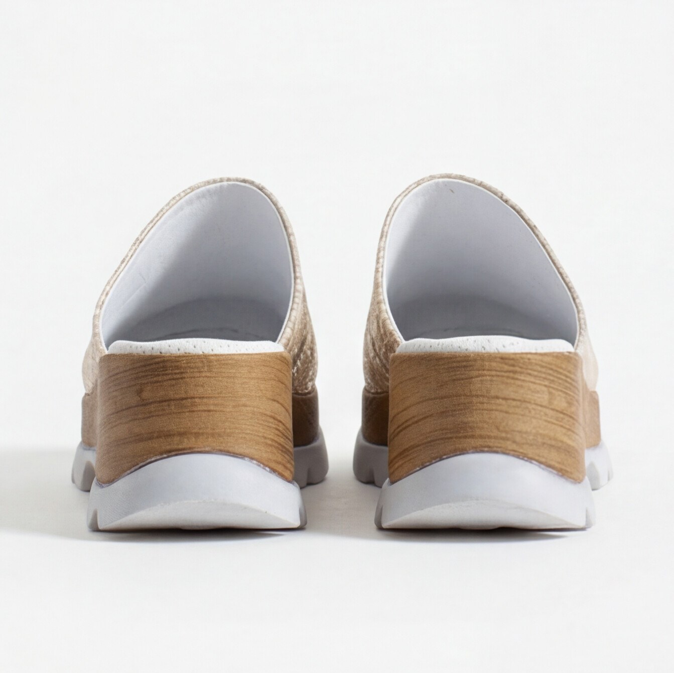 Омекотената стелка прави ходенето приятно през целия ден. Подметката е стабилна и добре балансирана, а широката основа дава сигурност при всяка крачка. Дървеният ефект в основата допълва топлия златист цвят и запазва усещането за класическо дървено сабо, но в по-съвременен и удобен вариант.