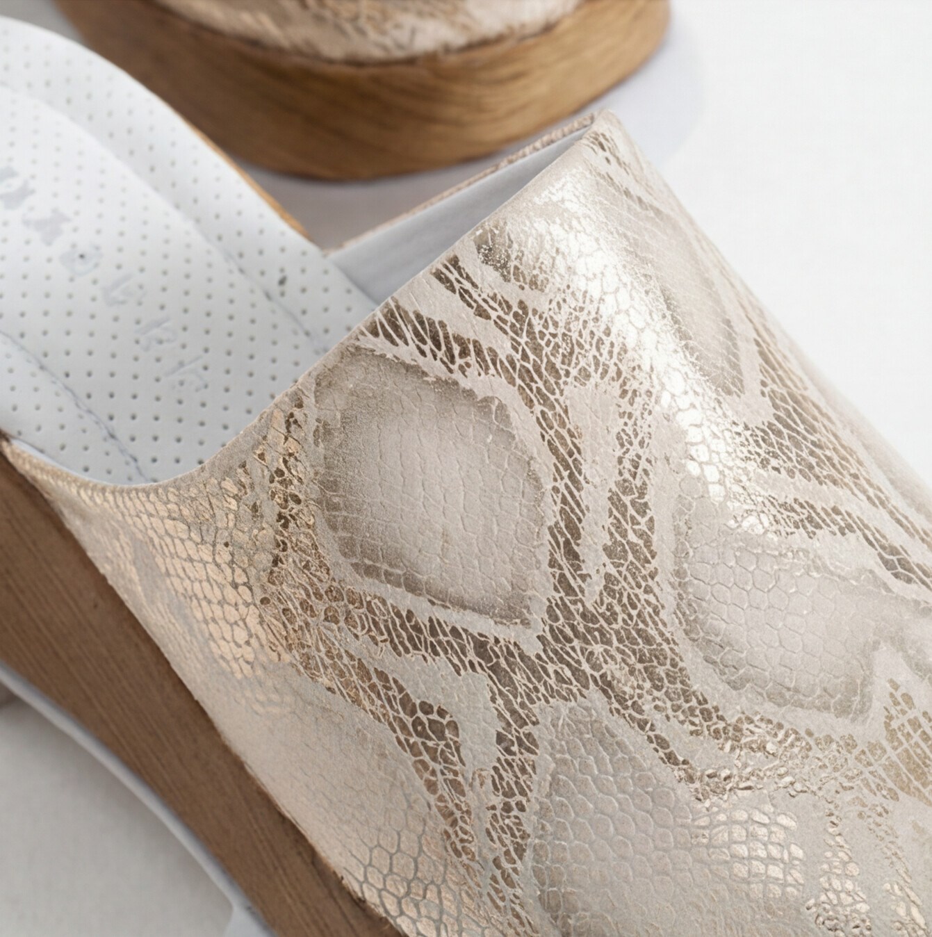 Затвореният връх придава по-изчистен и женствен силует, а моделът се комбинира еднакво добре с по-небрежни и с по-елегантни тоалети. Горната част е от естествена кожа със змийски принт в златисти нюанси, които хващат светлината и добавят фин акцент. Материалът е мек и приляга приятно по ходилото, без да стяга.